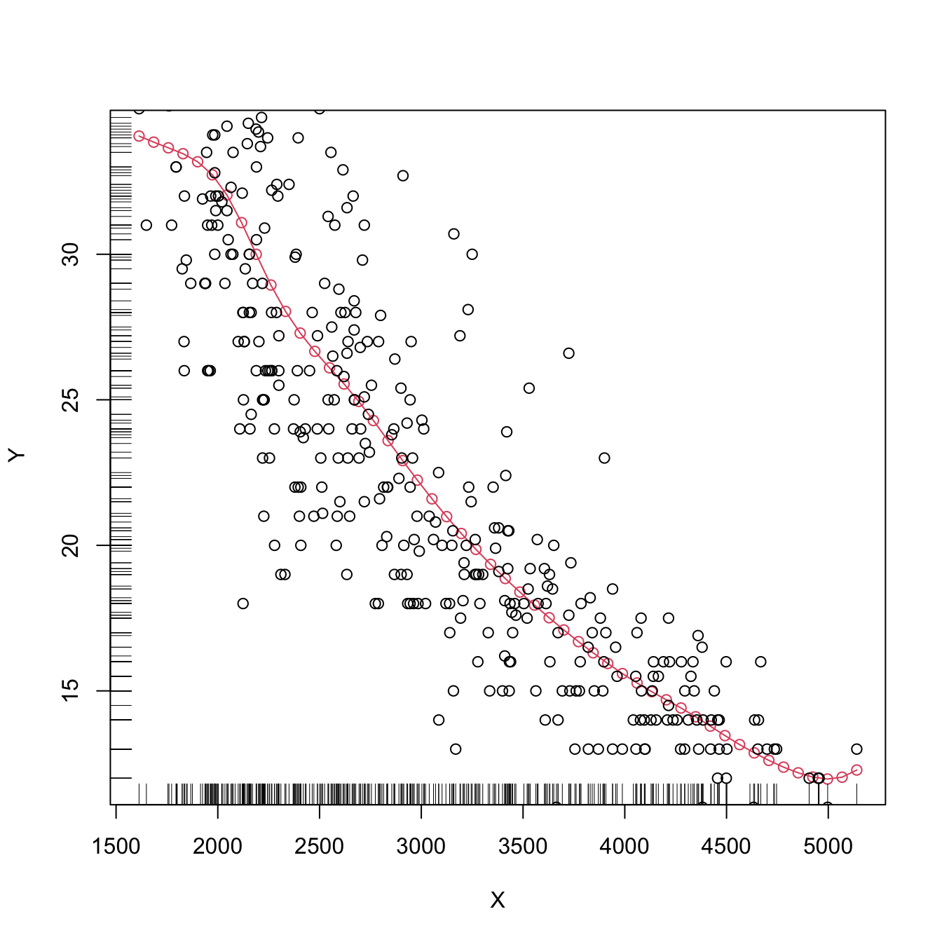 The np package (Hayfield and Racine 2008) provides a complete framework for performing a more sophisticated nonparametric regression estimation for local constant and linear estimators, and for computing cross-validation bandwidths. The two workhorse functions for these tasks are np::npreg and np::npregbw, which they illustrate the philosophy behind the np package: first, a suitable bandwidth for the nonparametric method is found (via np::npregbw) and stored in an rbandwidth object; then, a fitting function (np::npreg) is called on that rbandwidth object, which contains all the needed information.