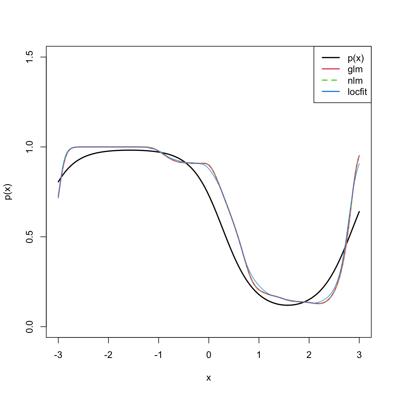 legend("topright", legend = c("p(x)", "glm", "nlm", "locfit"),