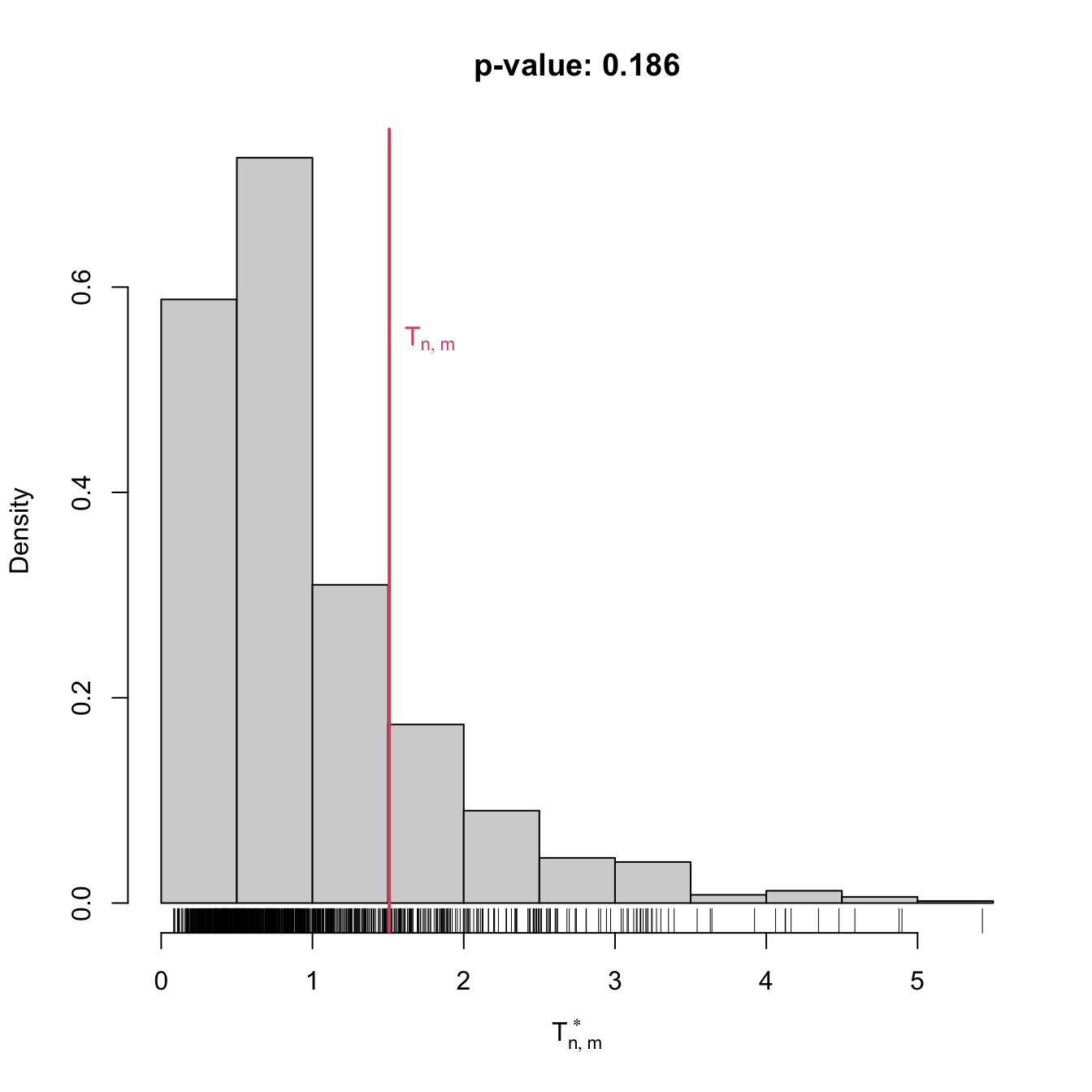 and emit a test decision from it. Modify it accordingly if rejection of \(H_0\) does not happen for large values of \(T_{n,m}.\)