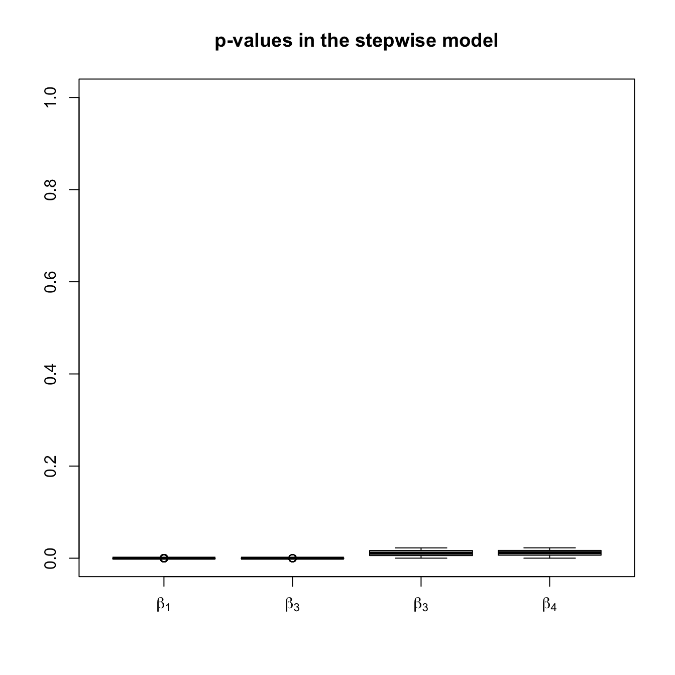 where \(\beta_1=\beta_2=1,\) \(\beta_3=\beta_4=0,\) and \(\varepsilon\sim\mathcal{N}(0,1).\) The next chunk of code analyses the significances of the four coefficients for: