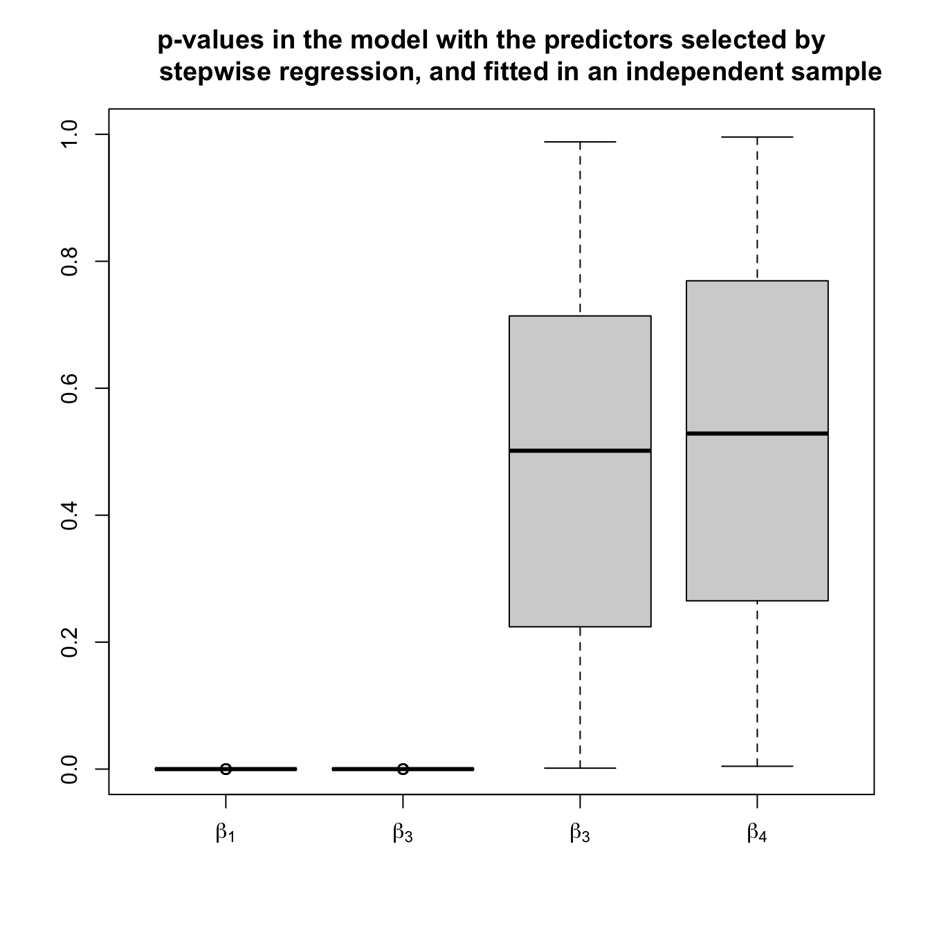 pvalues1) is uniform whenever \(H_0:\beta_j=0\) holds (for \(j=3,4\)) and concentrated around \(0\) when \(H_0\) does not hold (for \(j=1,2\)). - The model with predictors selected by stepwise regression. The inferences for the coefficients are biased: when \(X_3\) and \(X_4\) are included in the model is because they are highly significant for the given sample by mere chance. Therefore, the distribution of the \(p\)-values (