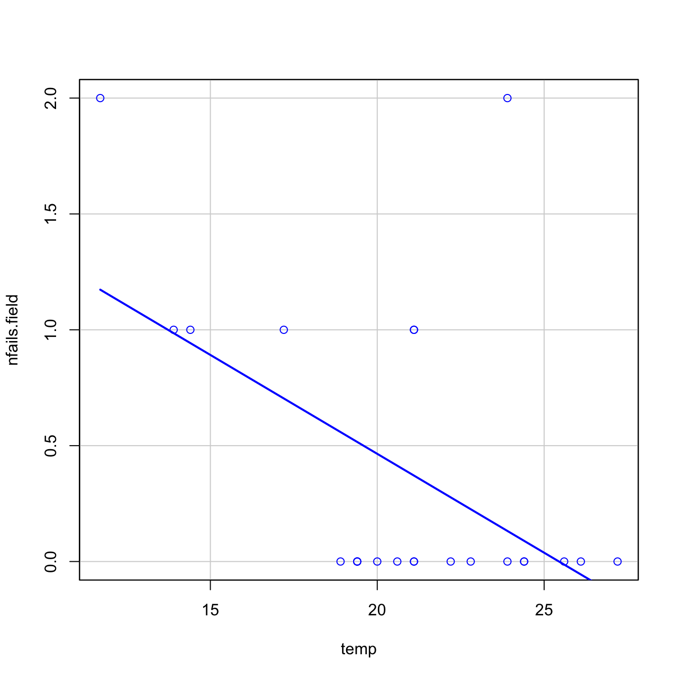 - However, as Figure 5.3b reveals, the trend for all launches indicates a clear negative dependence between temperature and number of incidents! Think about it in this way: the minimum temperature for a launch without incidents ever recorded was above \(18\) Celsius degrees, and the Challenger was launched at \(-0.6\) without clearly knowing the effects of such low temperatures.