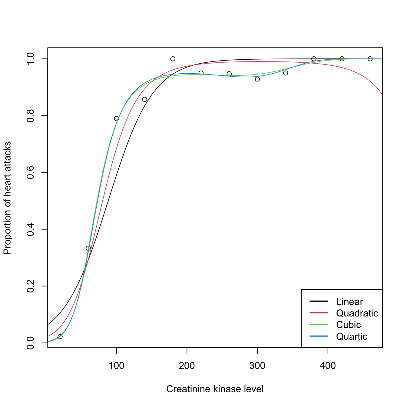 heart4 <- glm(prop ~ poly(ck, 4, raw = TRUE), family = binomial, data = heart,