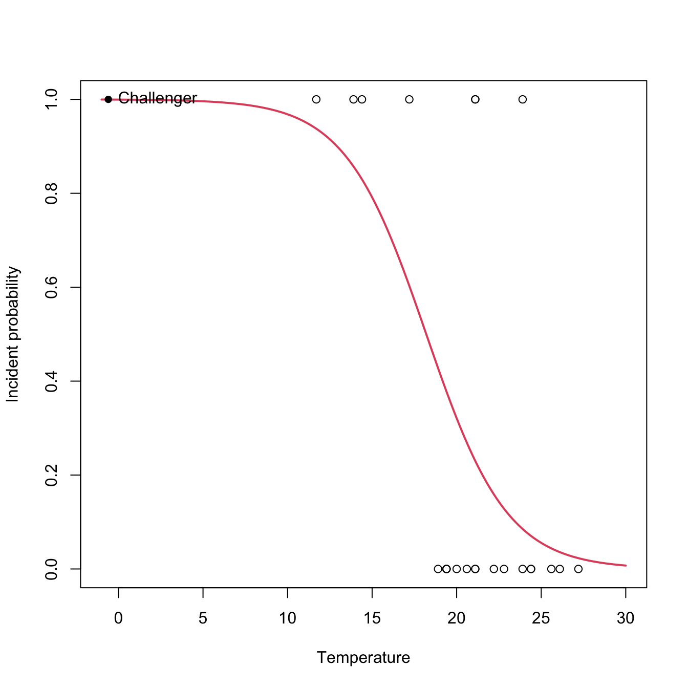 At the sight of this curve and the summary it seems that the temperature was affecting the probability of an O-ring incident (Q1). Let’s quantify this statement and answer Q2 by looking to the coefficients of the model: