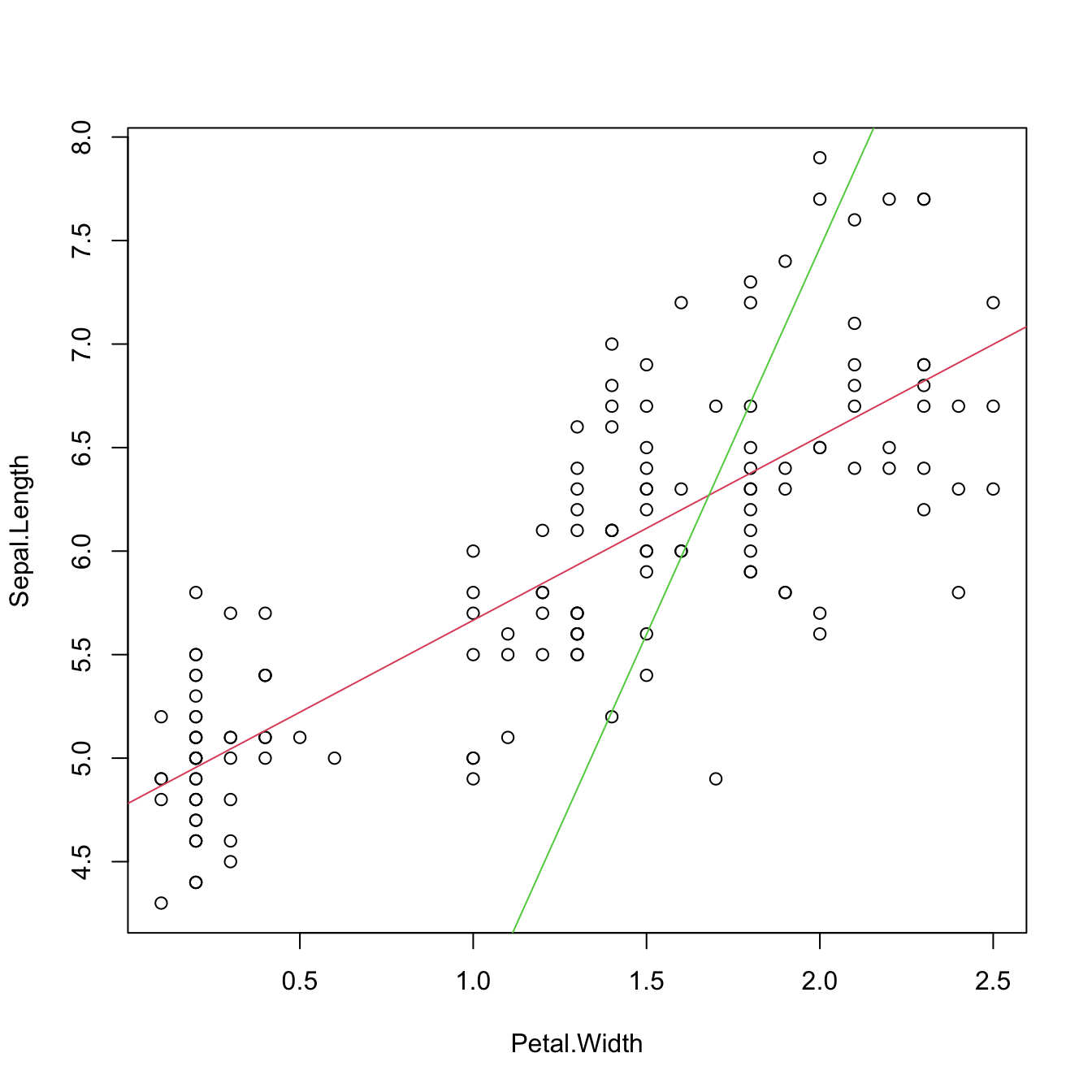 modCen0 <- lm(Sepal.Length ~ 0 + Petal.Width, data = irisCen)