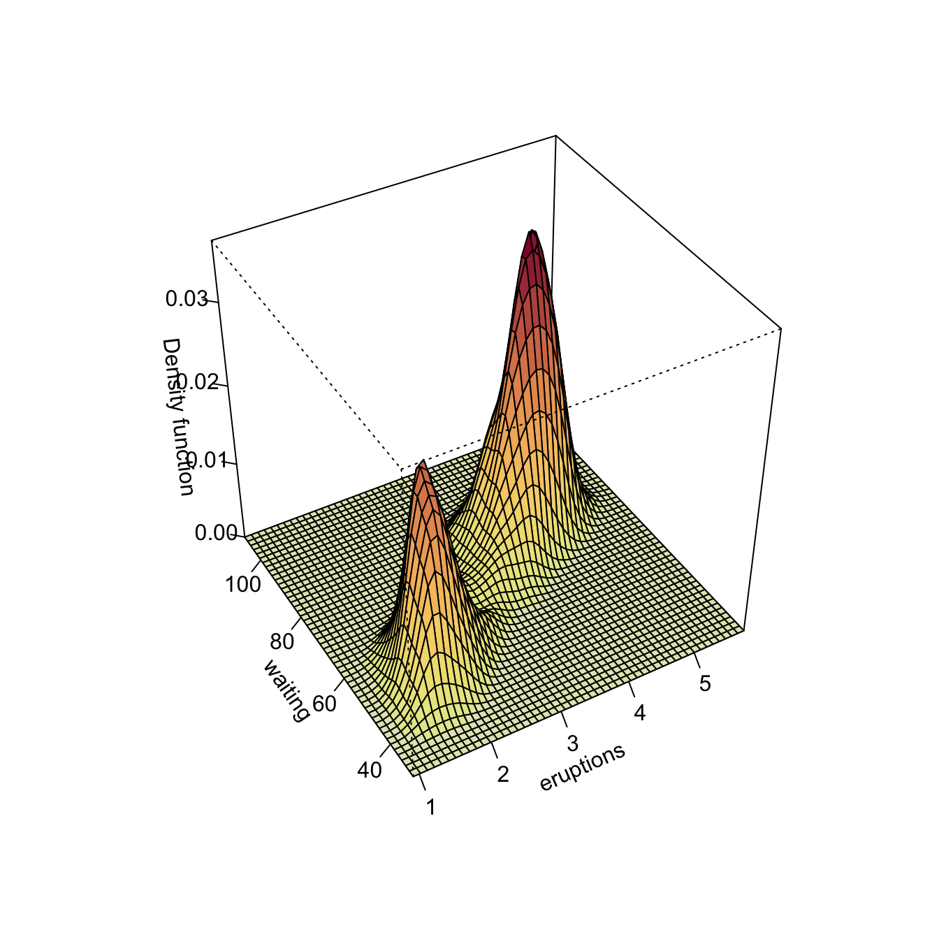 Multivariate kernel density estimation and bandwidth selection is not supported in base R, but the ks package implements the kde by ks::kde for \(p\leq6.\) Bandwidth selectors, allowing for full or diagonal bandwidth matrices are implemented by: ks::Hns (NS), ks::Hpi and ks::Hpi.diag (DPI), ks::Hlscv and ks::Hlscv.diag (LSCV), and ks::Hbcv and ks::Hbcv.diag (BCV). The next chunk of code illustrates their usage with the faithful dataset.