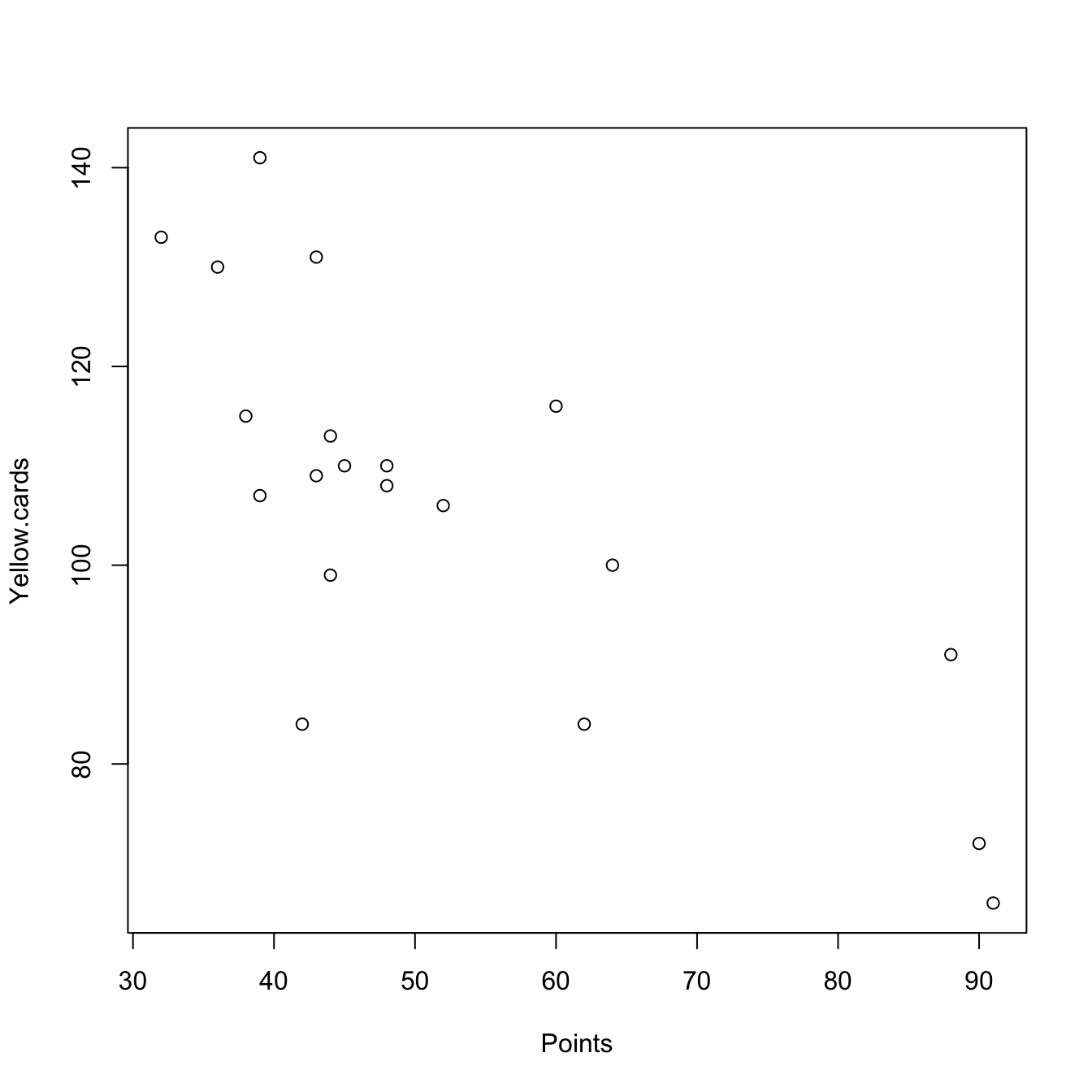 # We consider only a smaller dataset (Points and Yellow.cards)