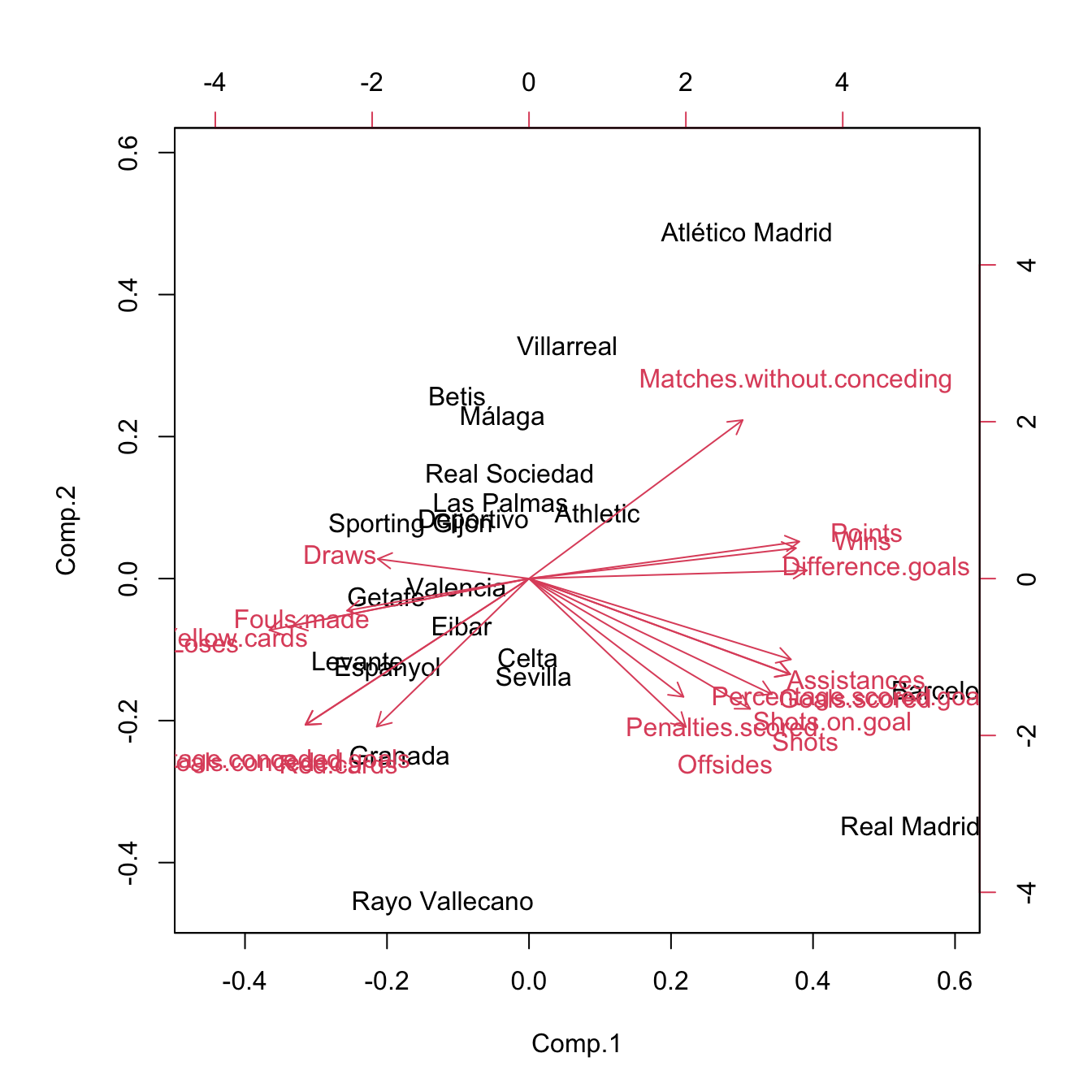 pca <- princomp(laliga[, -2], cor = TRUE)