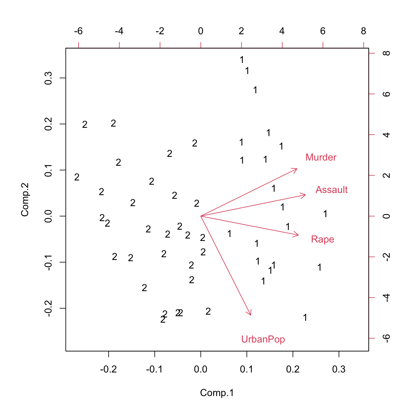 biplot(princomp(model.matrix(~-1 + Assault + Murder + Rape + UrbanPop, USArrests)),