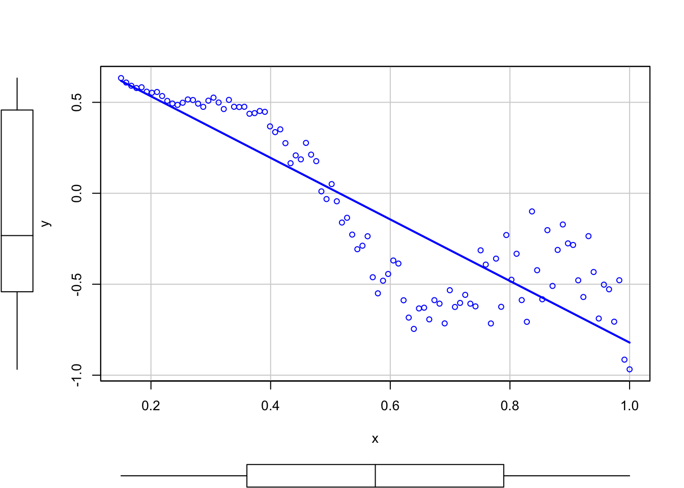 Trusting blindly the \(R^2\) can lead to catastrophic conclusions, since the model may not be correct. Here is a counterexample of a linear regression performed in a data that clearly does not satisfy the assumptions discussed in Section 2.4, but despite so it has a large \(R^2\). Recall how biased will be the predictions for \(x=0.35\) and \(x=0.65\)!