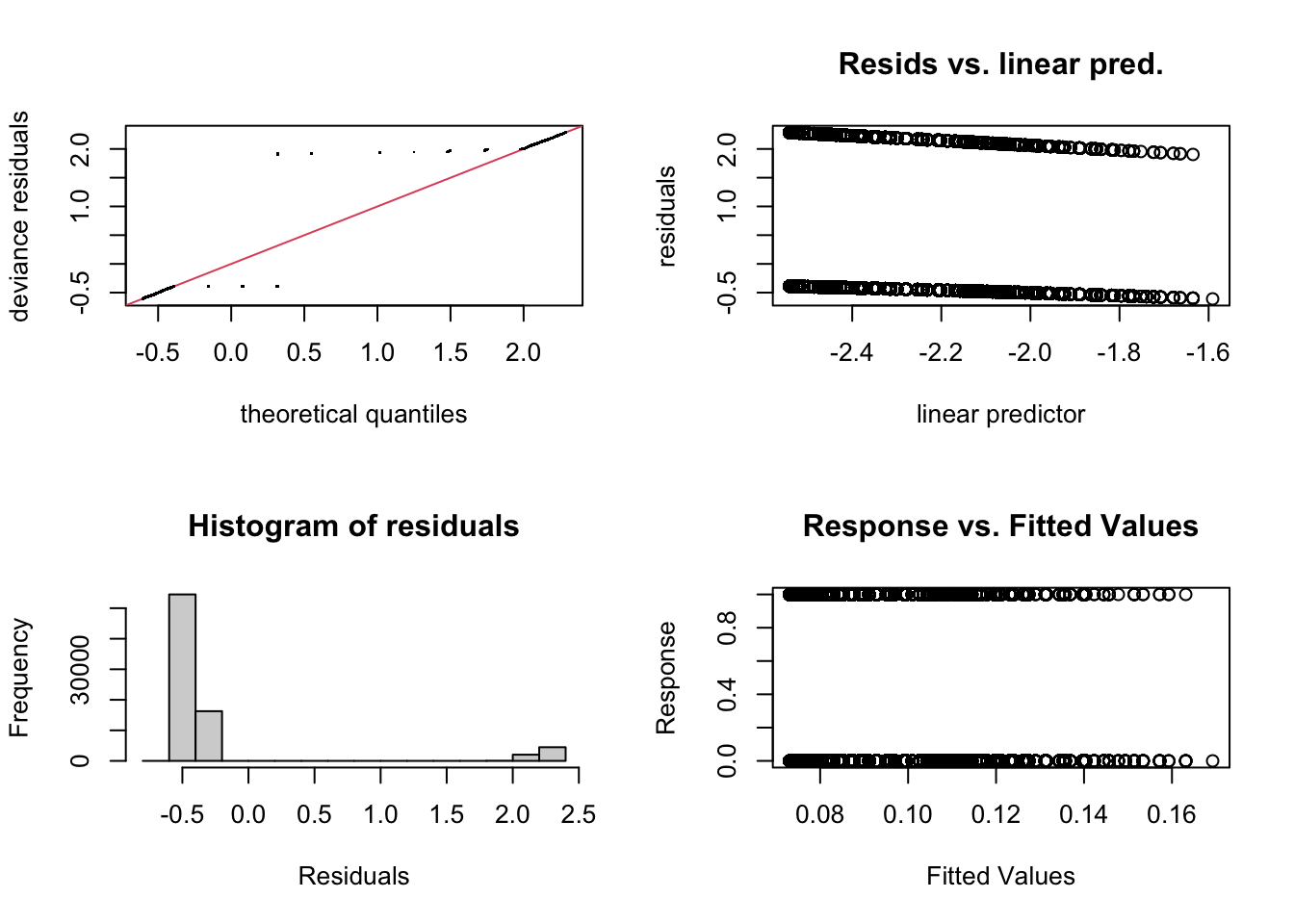 Residual plots for fitted values are a good way to check residuals in the normal case. But for binary outcomes, they look odd and are not helpful.