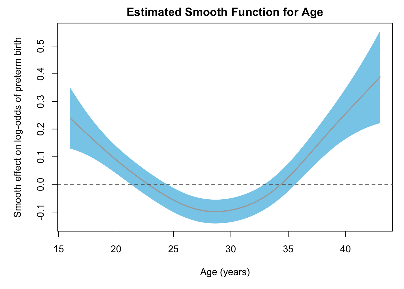 library (mgcv)library(ggplot2)library(dplyr)# Pre-term births with non-linear age effectload(paste0(getwd(), '/data/PTB.RData'))fit.gam =gam(ptb~s(age) + male + tobacco ,family = binomial, data = dat)summary(fit.gam)
