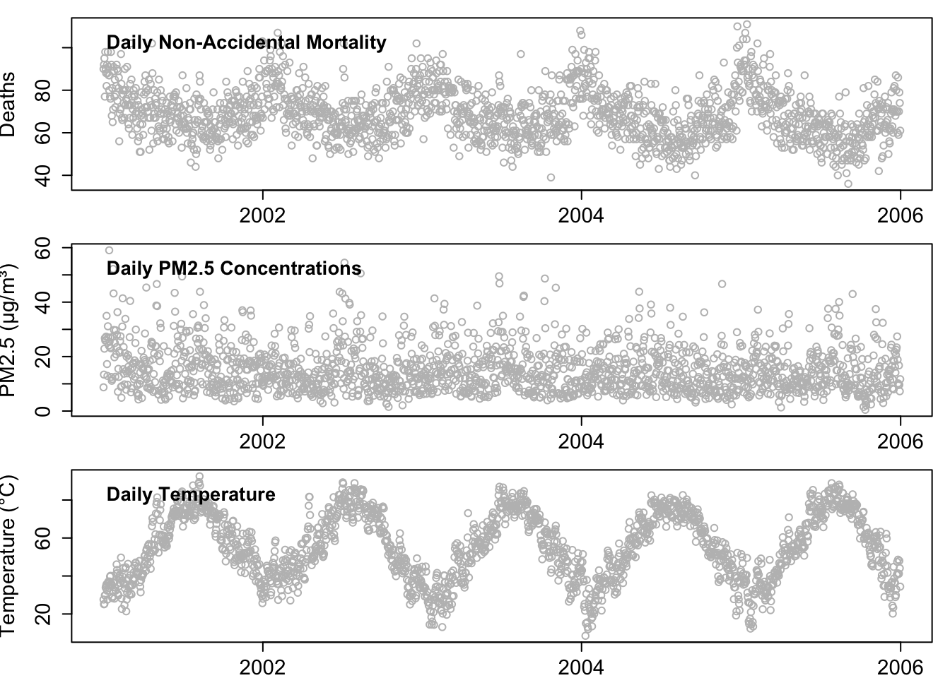 We are interested in the association between daily variation in mortality counts and daily variation in air pollution exposure (PM₂.₅). In a time-series design, the population serves as the unit of analysis—our outcome represents total daily deaths in a defined area. Time-varying confounders (e.g., temperature, humidity, long-term trends) are flexibly controlled using smooth functions.