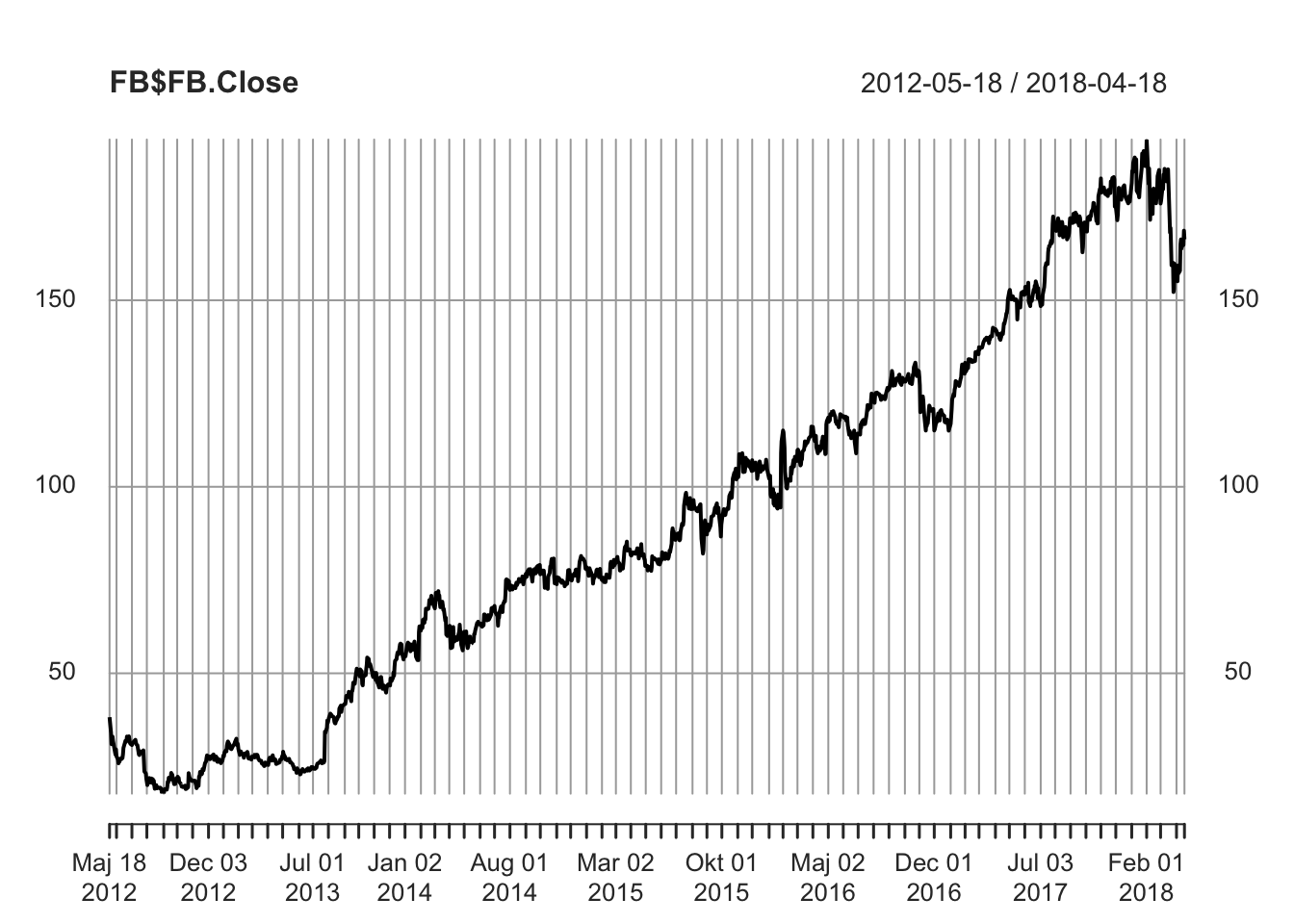 key <- "..............." # Byt ut .... mot din nyckelVi kan exempelvis ladda ner data Facebooks aktie, använd funktionen getSymbols(), argumentet src är varifrån vi hämtar data, api.key är helt enkelt din API-nyckel. Data kommer sparas som ett objekt FB.