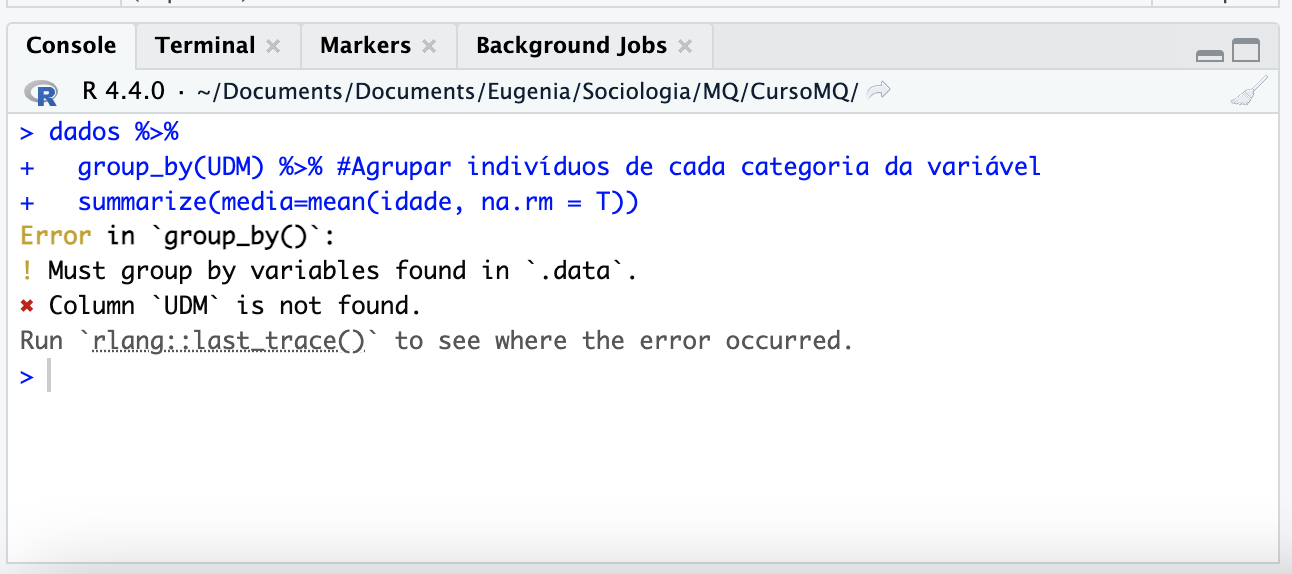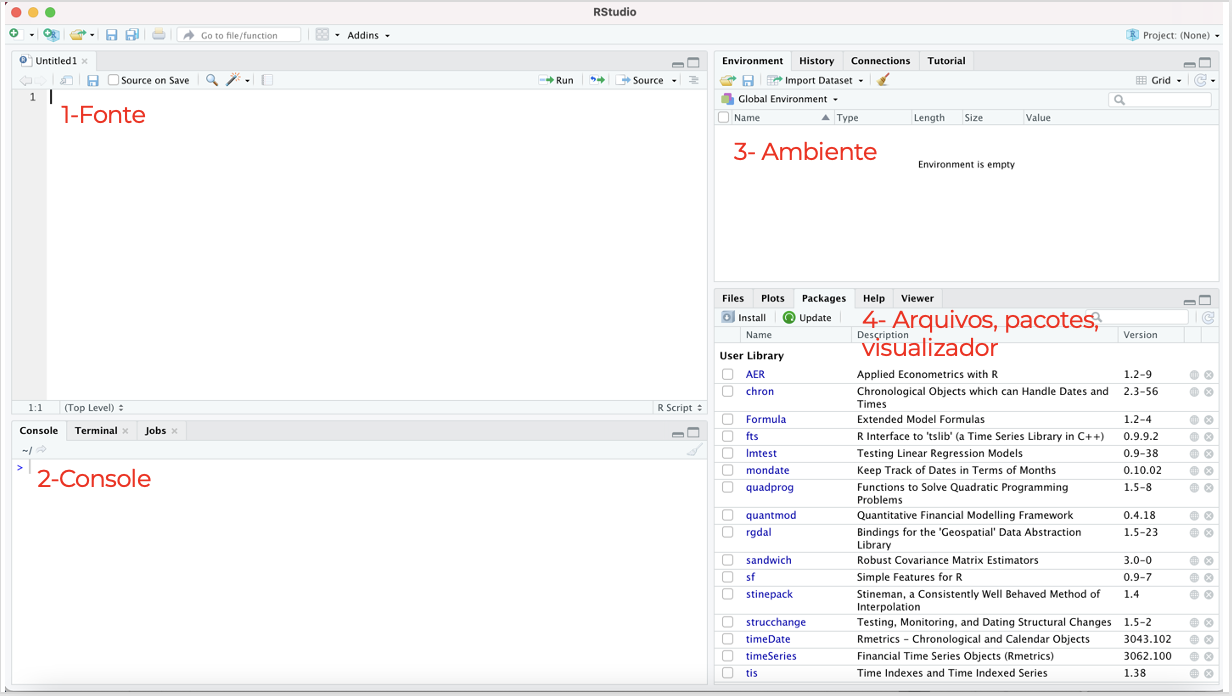 2-Painel Console: Onde o código da fonte é avaliado pelo R. Pode-se também utilizar o console para realizar códigos rápidos, sem salvá-los. O console indica se a leitura do código foi bem sucedida e aponta mensagens de erro. É sempre importante ler atentamente as mensagens de erro, que nos indicam o problema no código.
