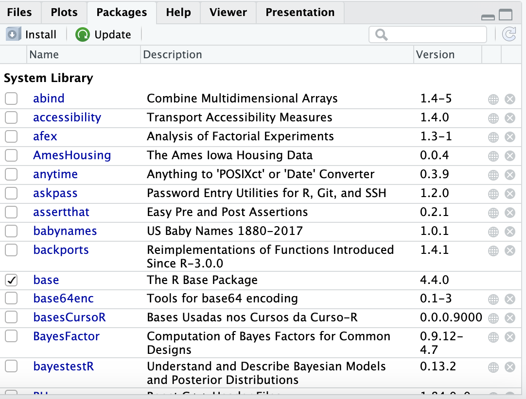 Em Packages estão listados os pacotes instalados. Você pode verificar quais estão carregados e, caso necessário, poderá carregar algum pacote necessário para a sua análise. Também é possível instalar e atualizar pacotes.