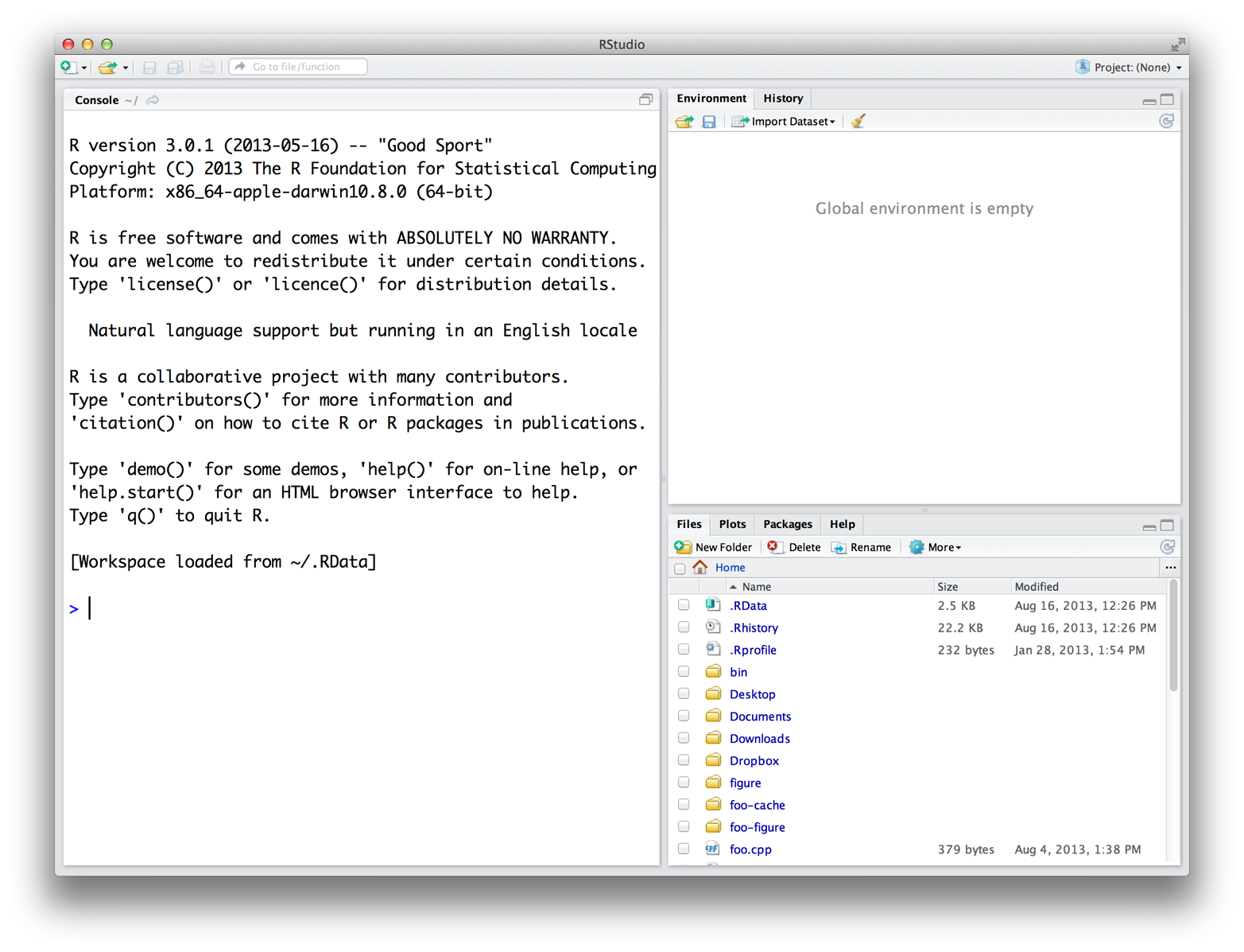 After installing RStudio, you can open it just like every other application on your machine. When you open it for the very first time, a window will appear that looks like this:
