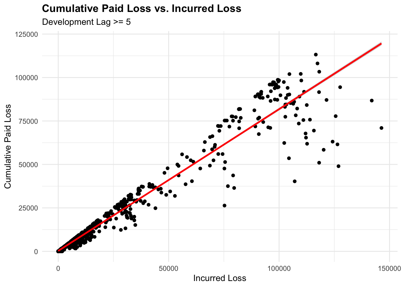We create a scatterplot for representing the relationship between IncurLoss and CumPaidLoss for both, the entire dataset and for claims with a development lag of 5 years or more:
