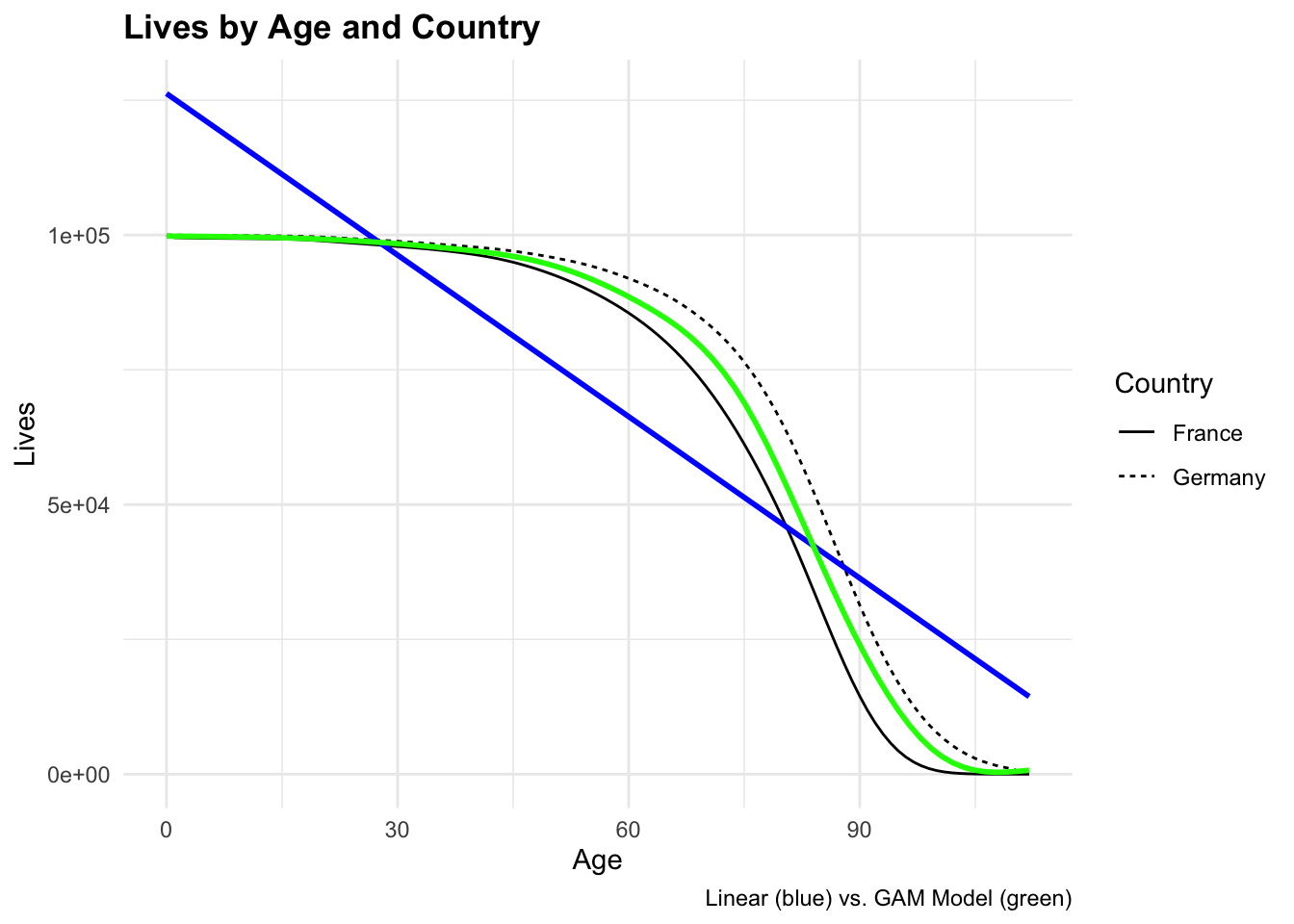 Let’s construct a GAM model to predict the number of lives based on age and country, using the poly() function to include a polynomial term for age: