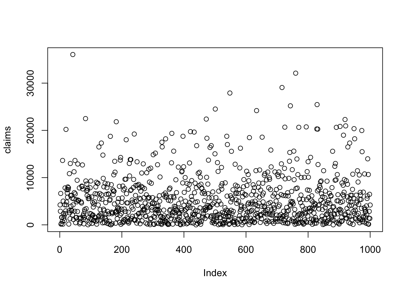 num_claims <- 1000For reproducibility, we can use the set.seed() function which assures that the random numbers generated are the same each time the code is run. Use the rexp() function to generate random numbers from an exponential distribution. And finally, plot the data using the plot() function.