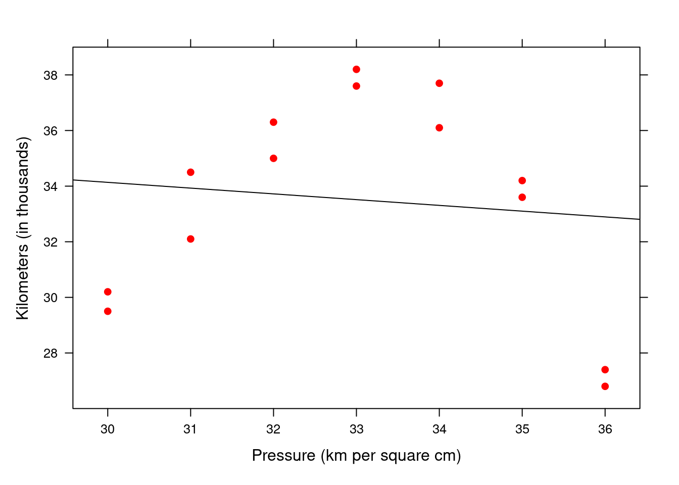 Test at a 10% level of significance whether a linear correlation between pressure and number of kilometers before the tire is weared out exists.