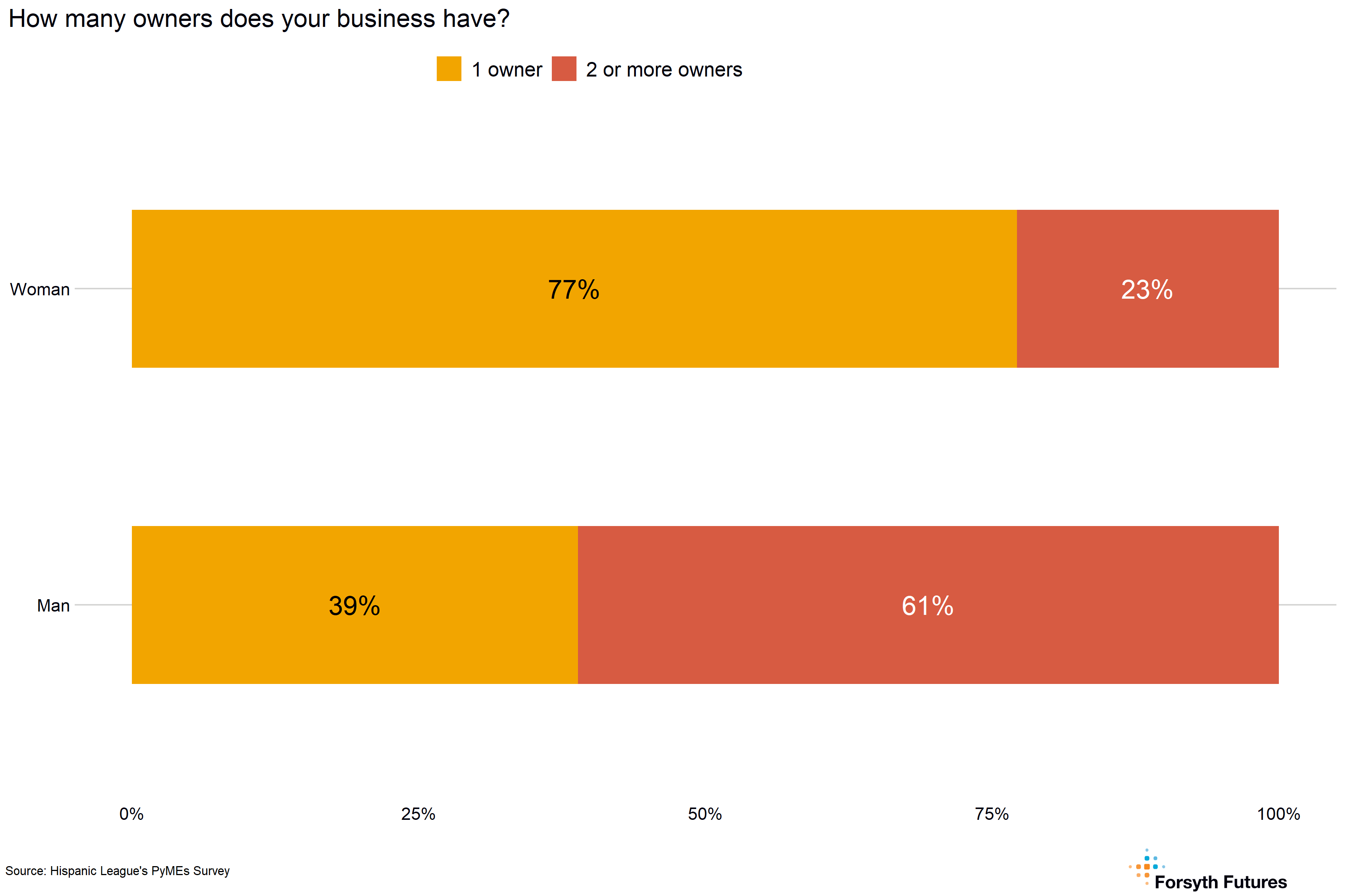 Most current business owners reported having a single business owner (58%), while 17% had two business owners, 12% had three business owners, and 13% had four or more business owners. Gender was the only disaggregation with statistically significant differences in the number of business owners, with men being more likely to have two or more business owners at 61% compared to 23% for women respondents.