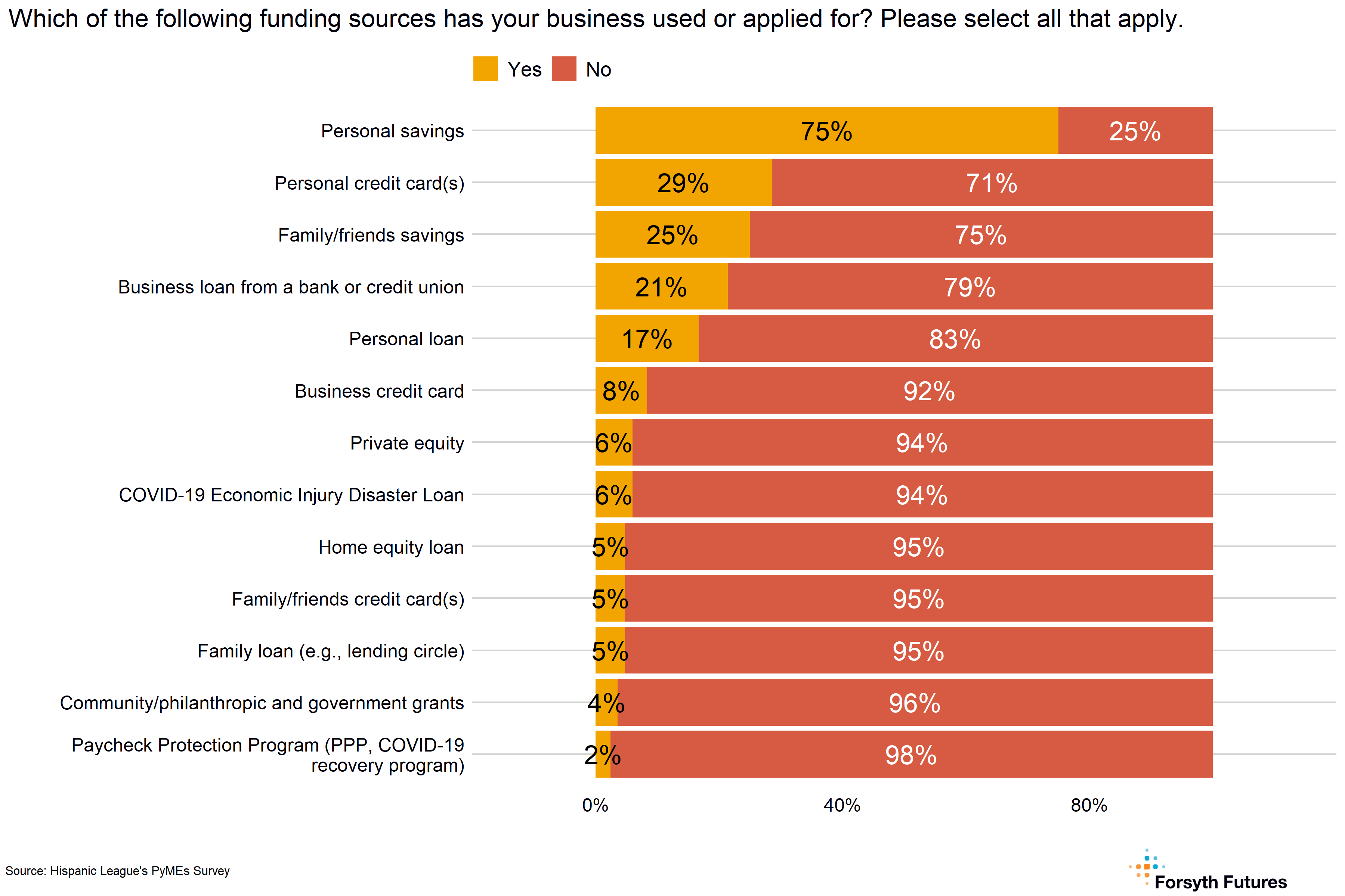 Most current owners reported using personal savings (75%) as a funding source for their business. The subsequent most common funding sources respondents used for their business were personal credit card(s) (29%), family/friend’s savings (25%), and a business loan from a bank or credit union (21%).