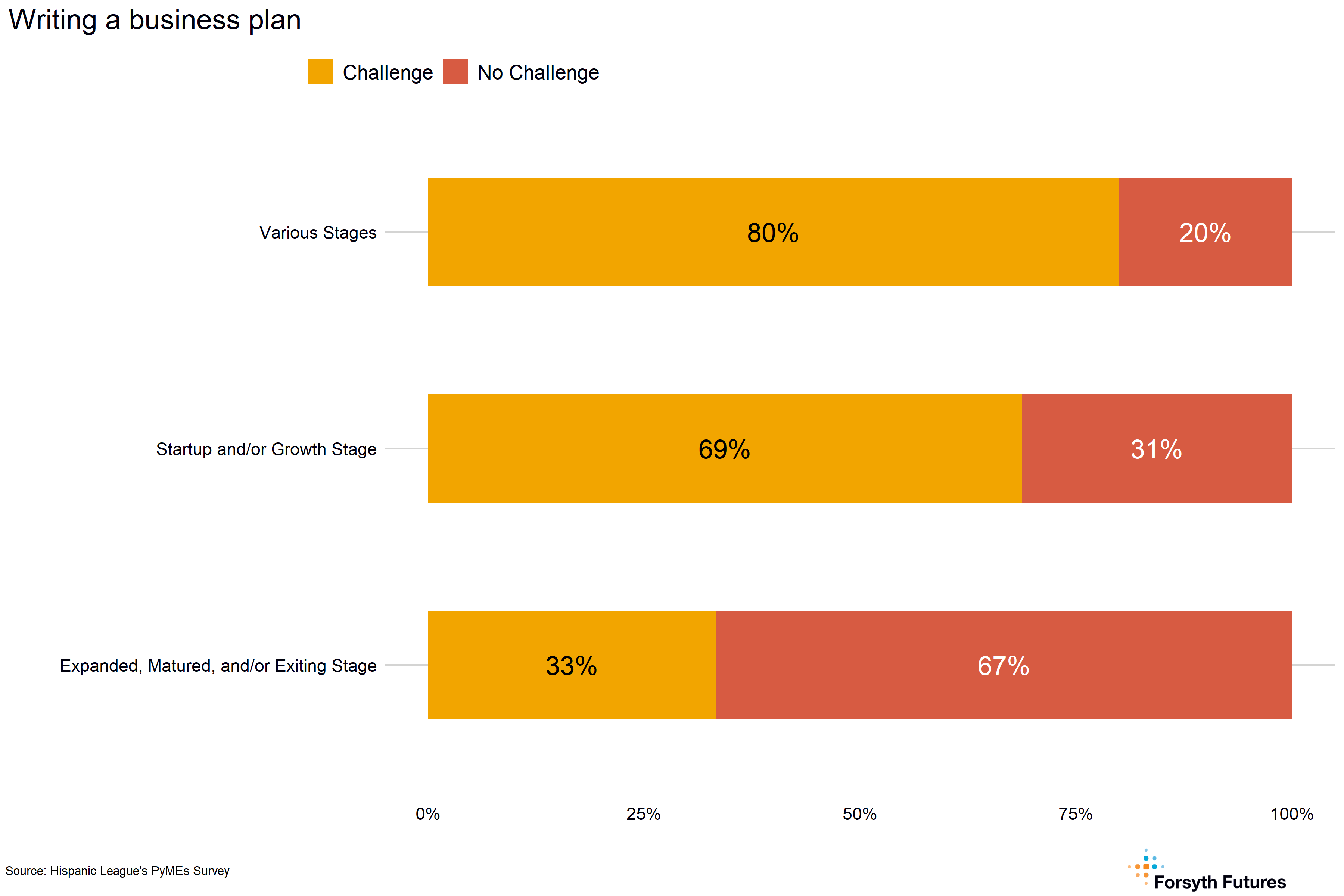 - 73% of current and prospective owners describe marketing / advertising challenges, and just over two-thirds indicate writing a business plan is a challenge for them. The percentage of owners who describe writing a business plan as a marketing / advertising challenge varies by the development stage of the business.