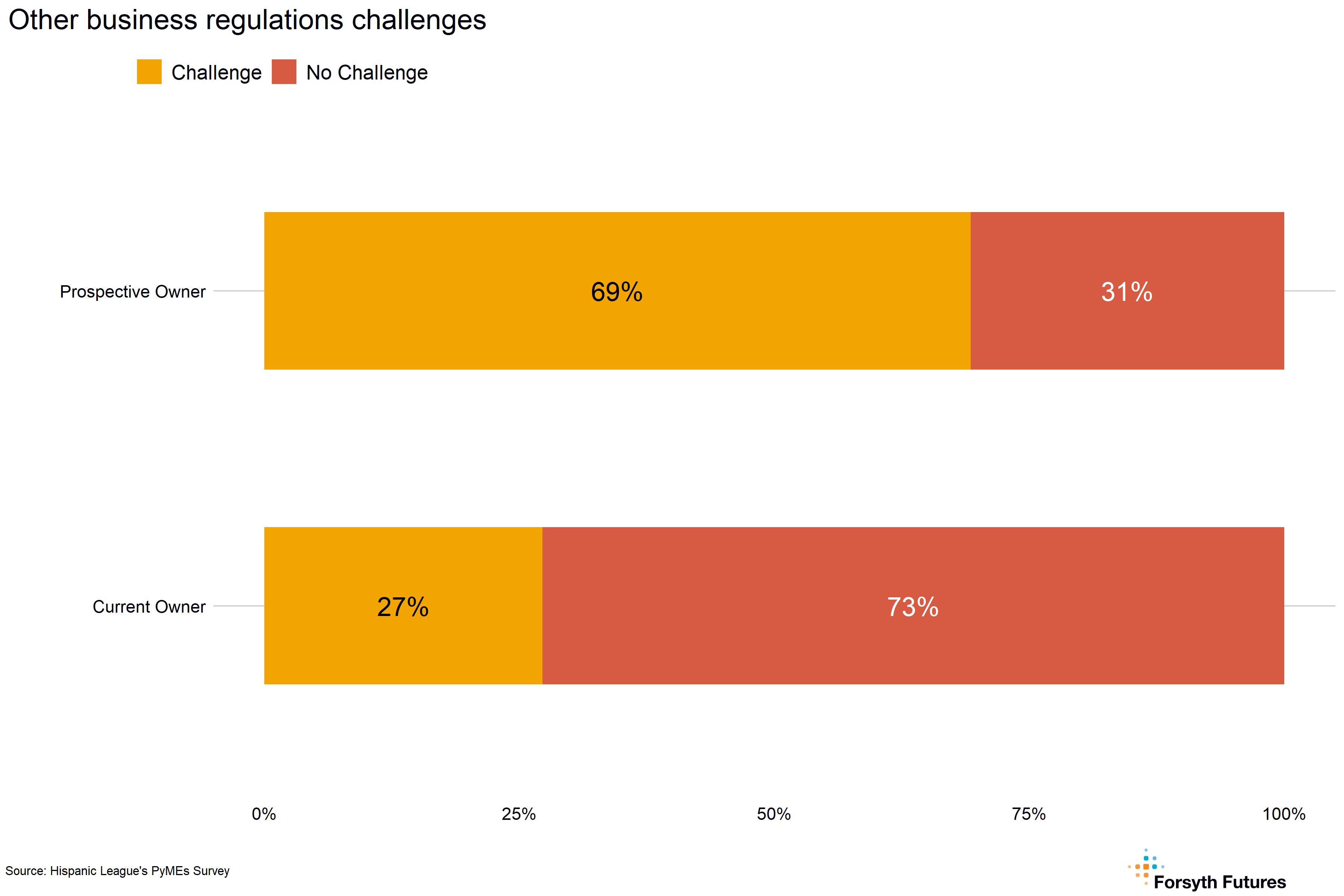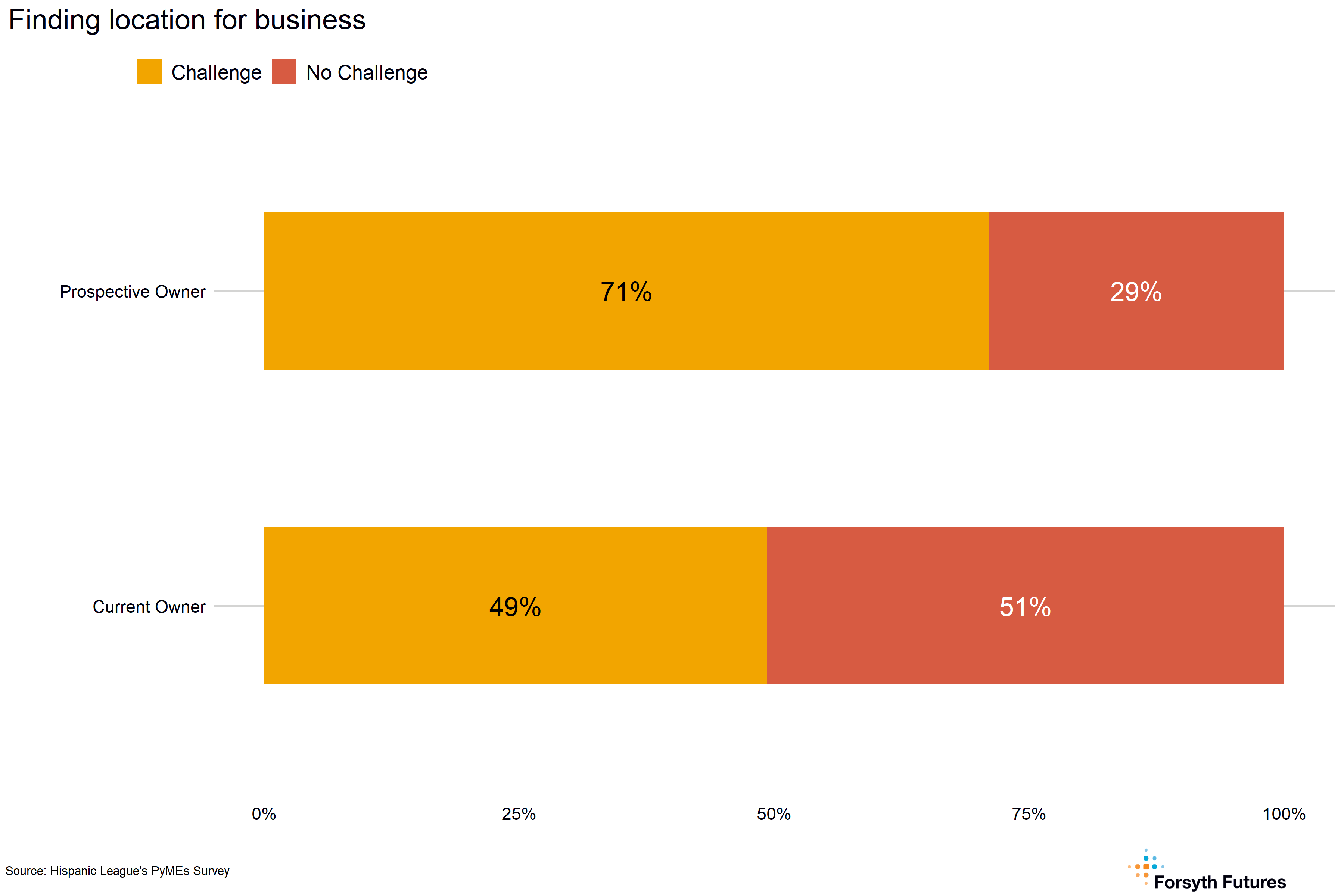 Prospective owners are more likely than current owners to have challenges finding a location for a business — about 71% of prospective owners identify this as a challenge, compared to 49% of current owners.