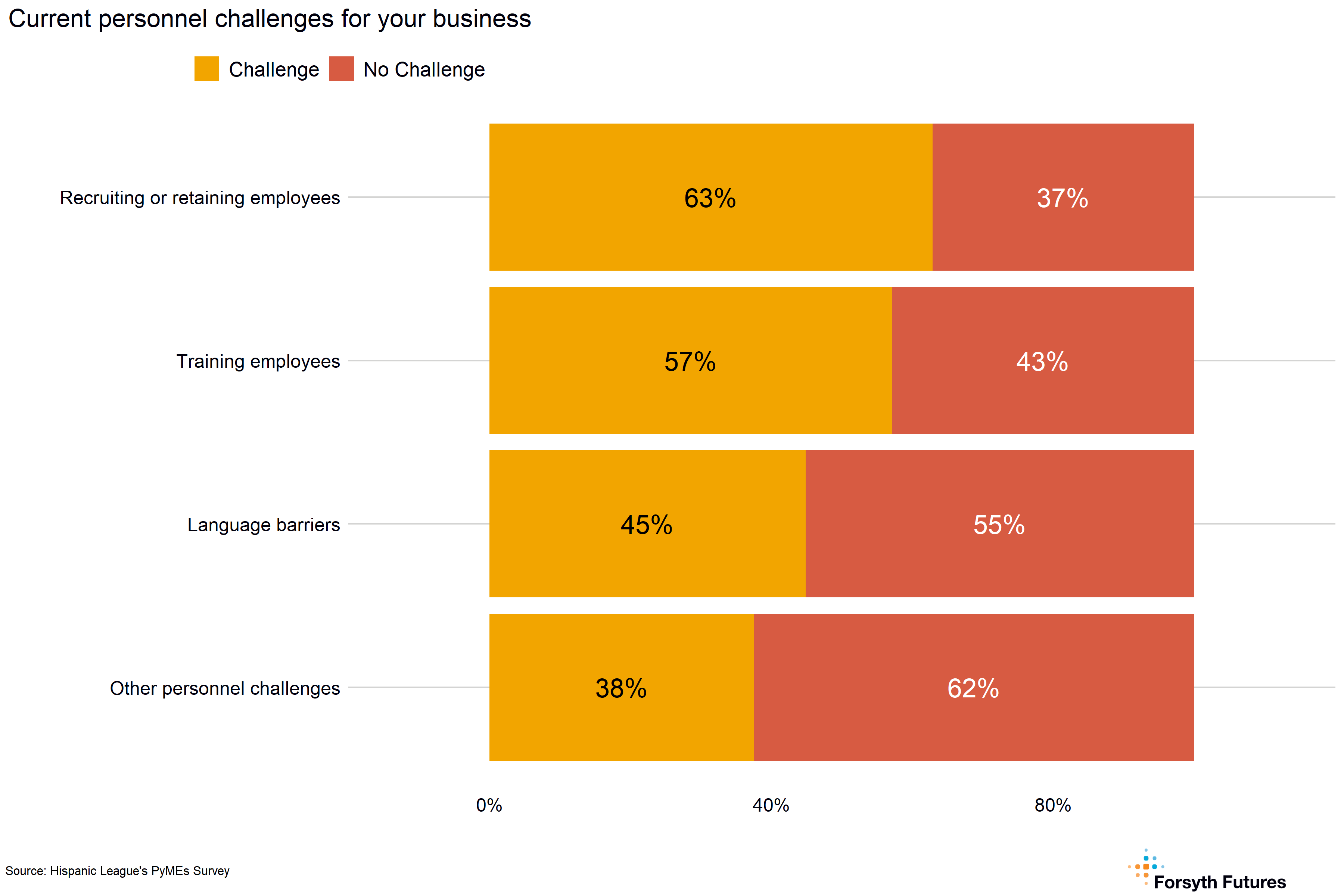 Most current and prospective business owners had personnel business challenges related to recruiting or retaining employees (63%) and training employees (57%). Other personnel challenges not listed but mentioned in the survey included a general comment about difficulty finding staff.