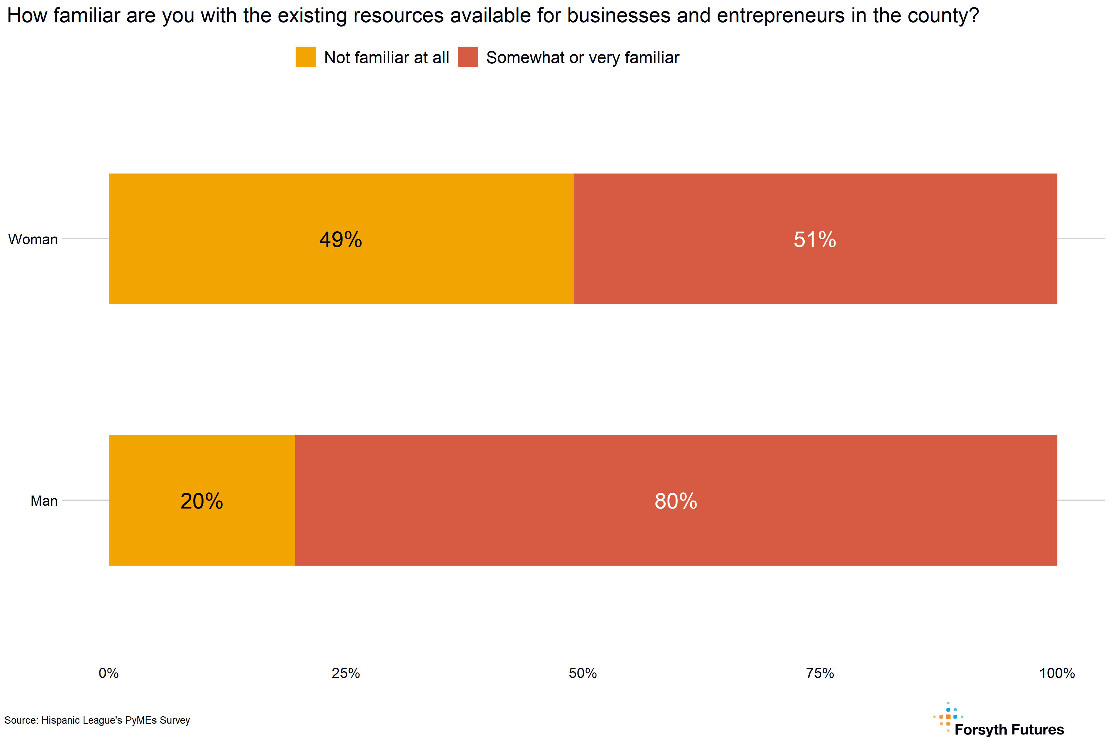 Men were more likely to be either somewhat familiar or very familiar (80%) with business resources in the county than women (51%).