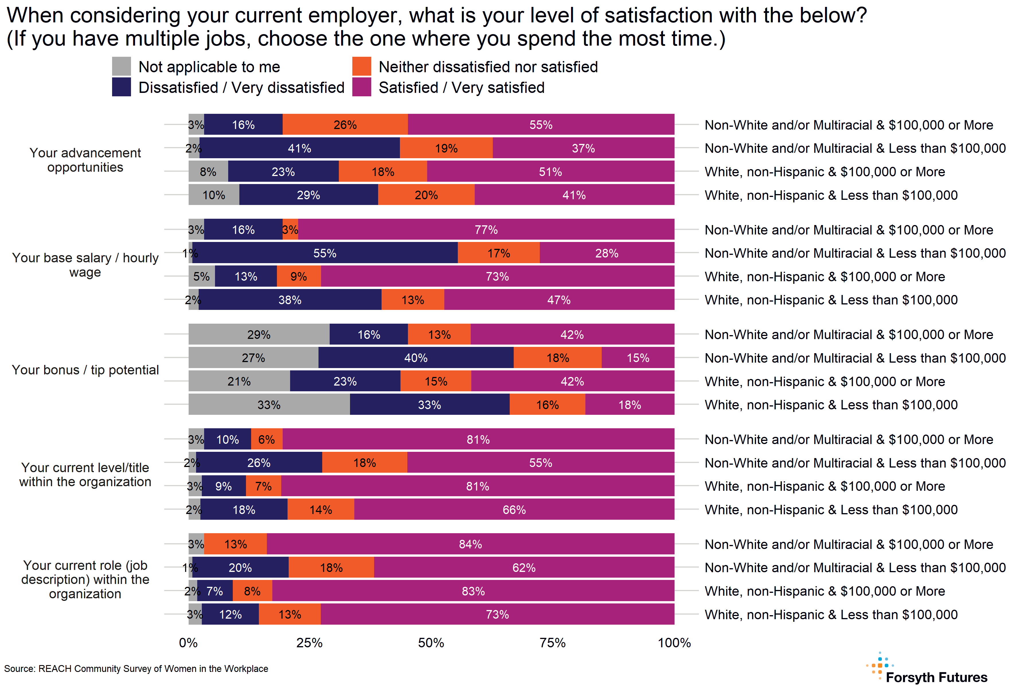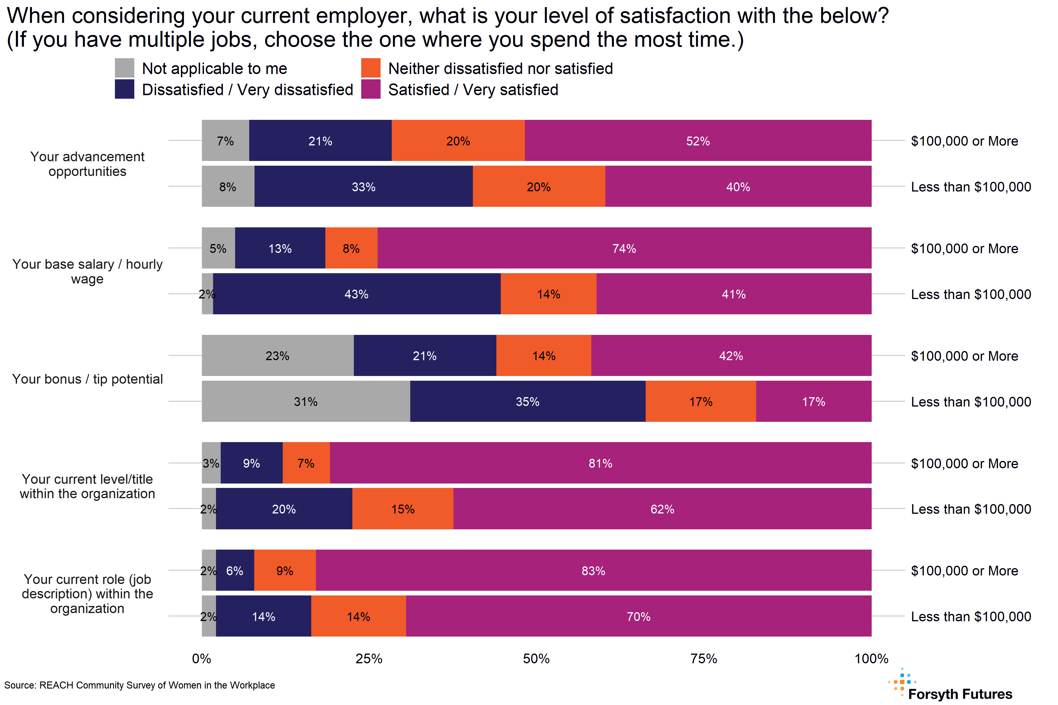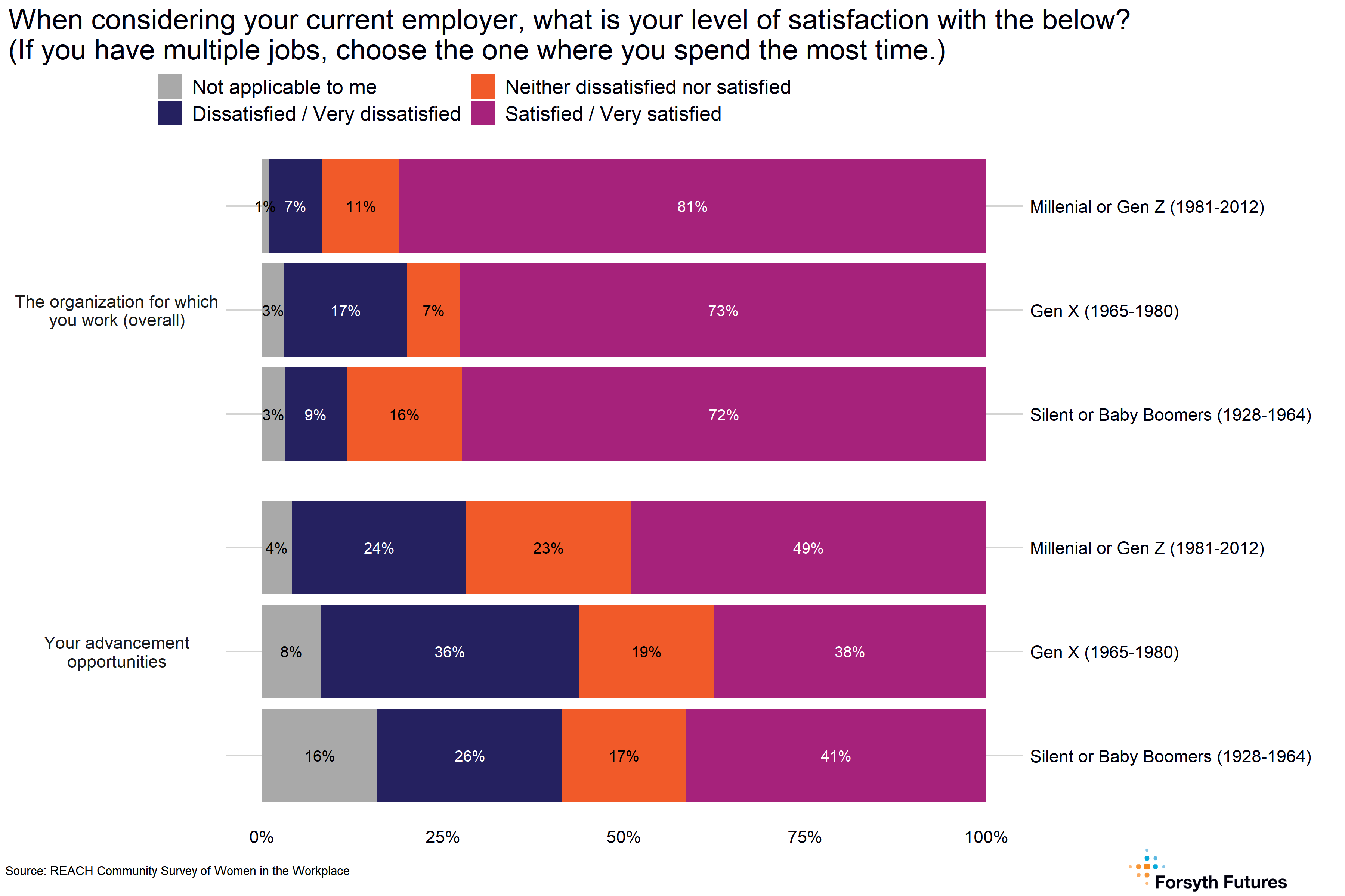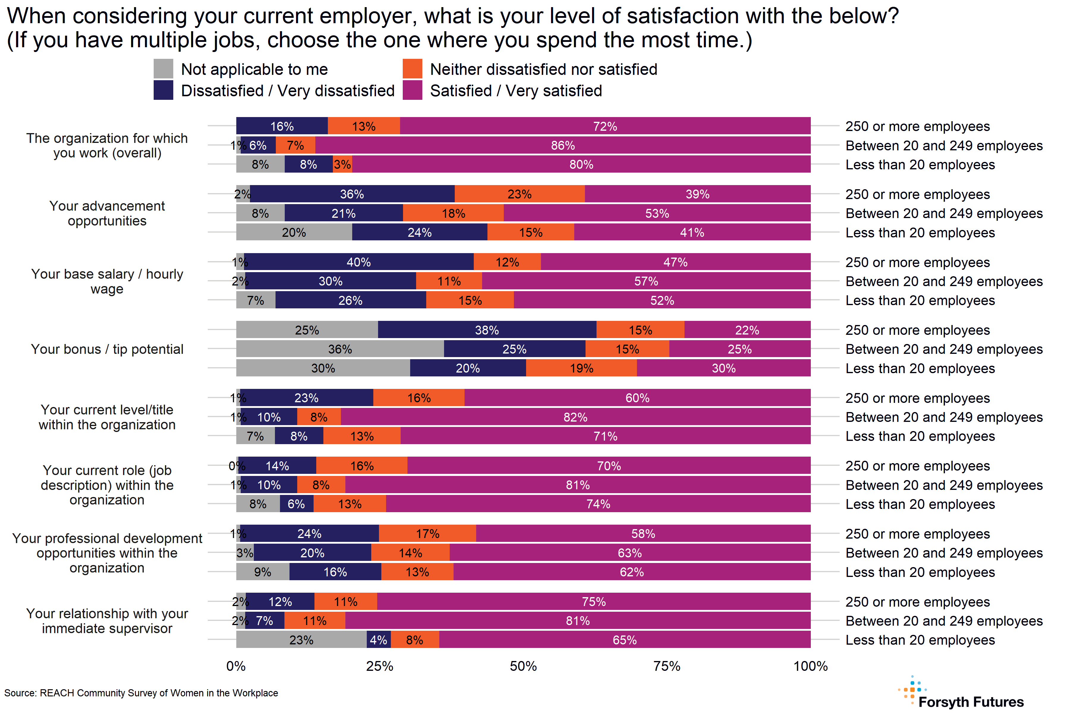 - Women’s level of satisfaction with their employers relating to advancement opportunities was the only aspect of satisfaction with their employer that varied consistently across all disaggregations.