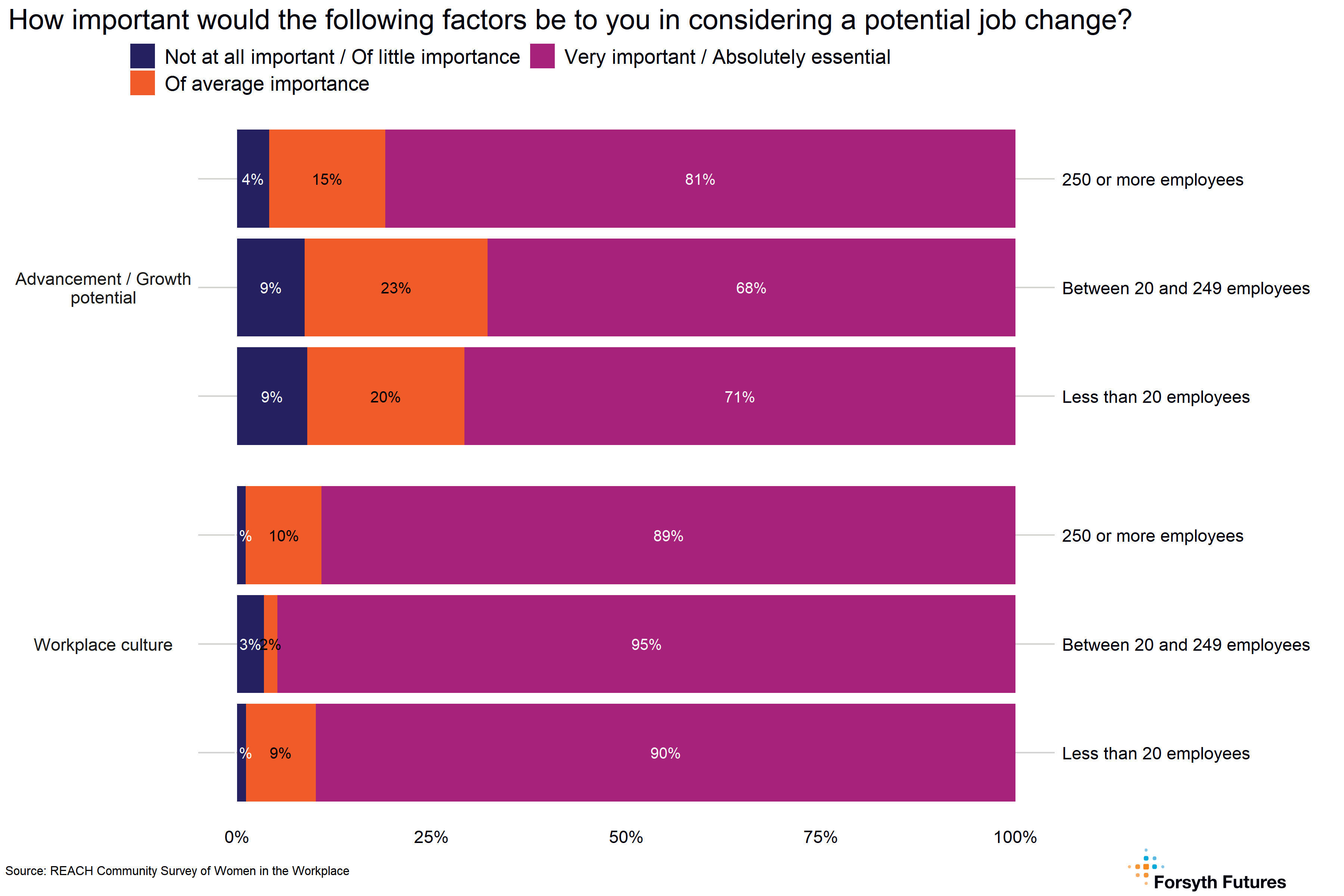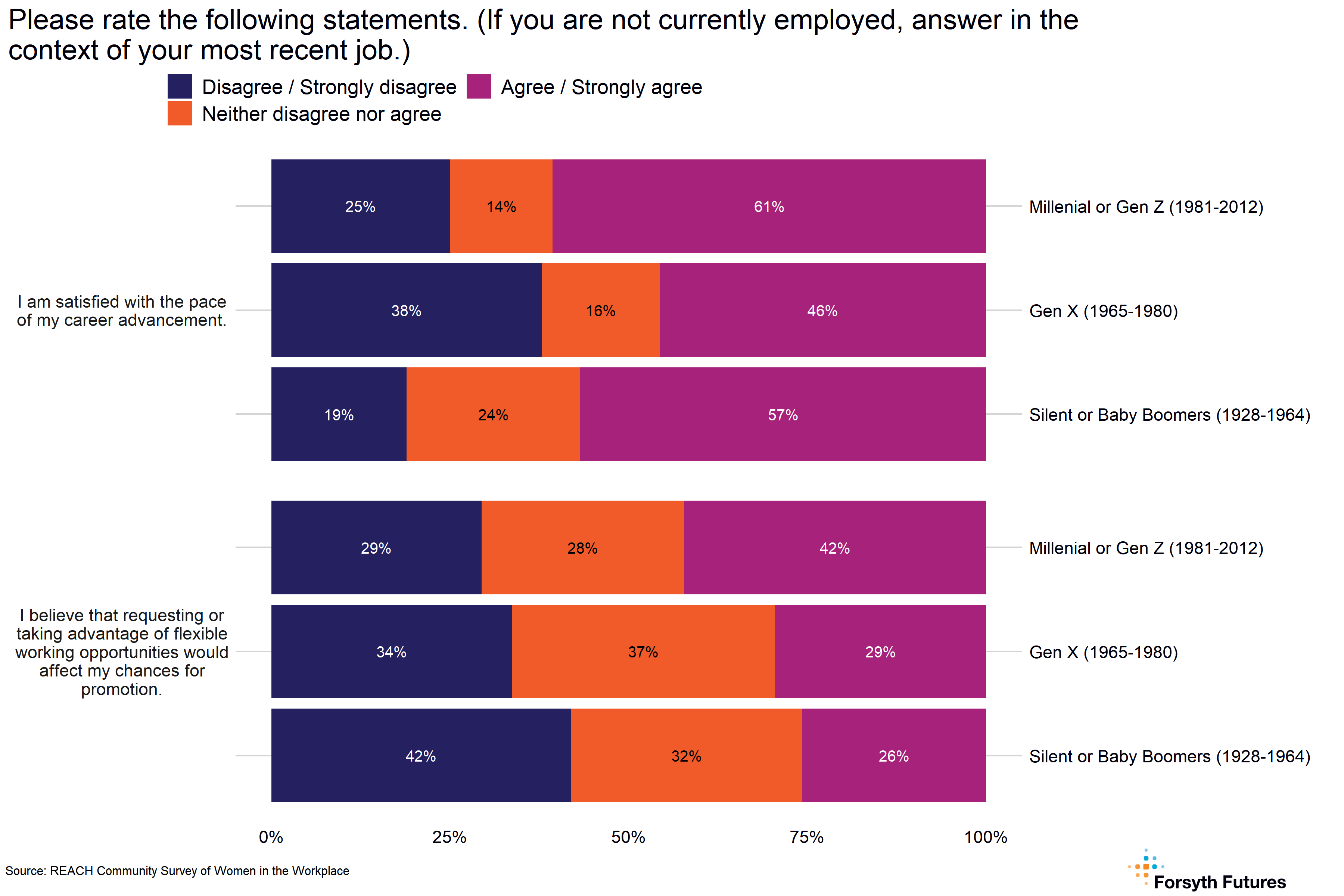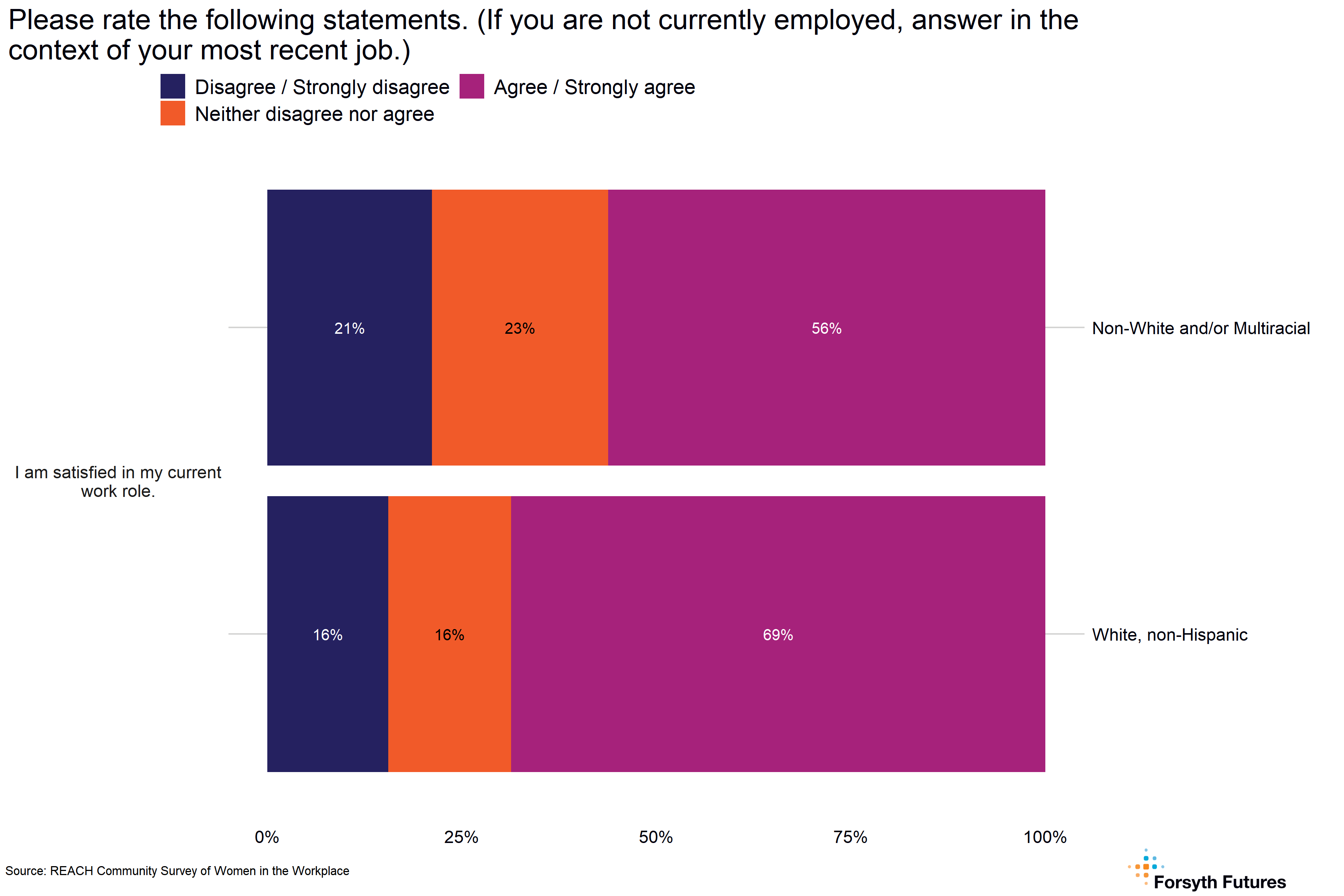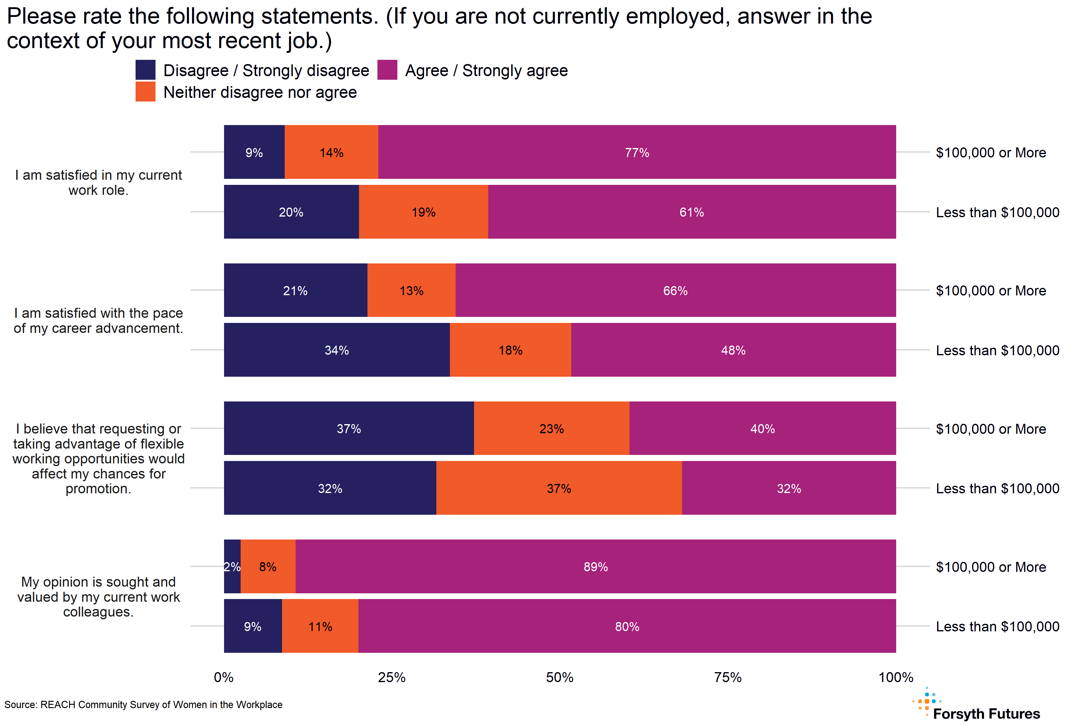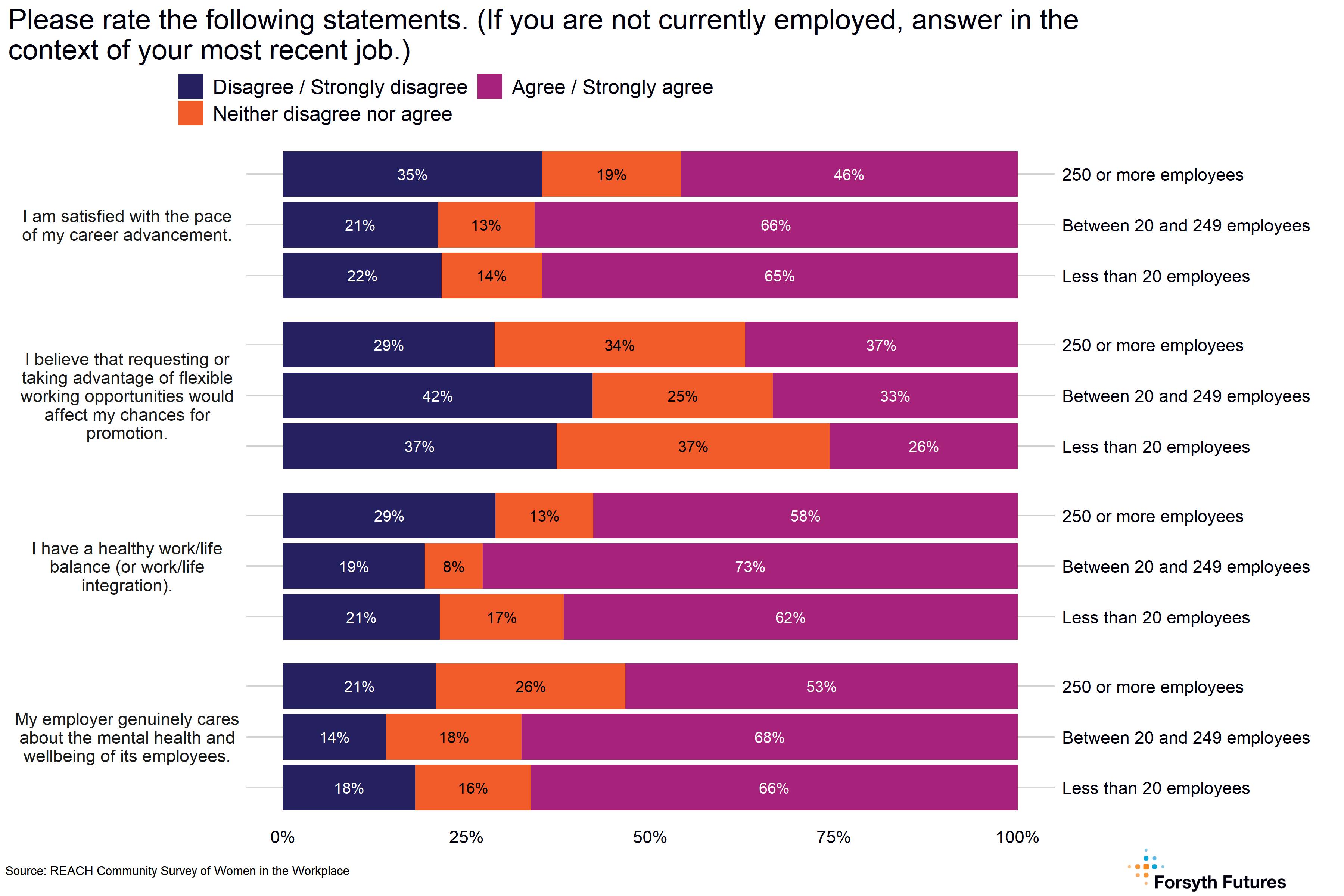 - Women’s level of satisfaction with their employers relating to advancement opportunities was the only aspect of satisfaction with their employer that varied consistently across all disaggregations.
