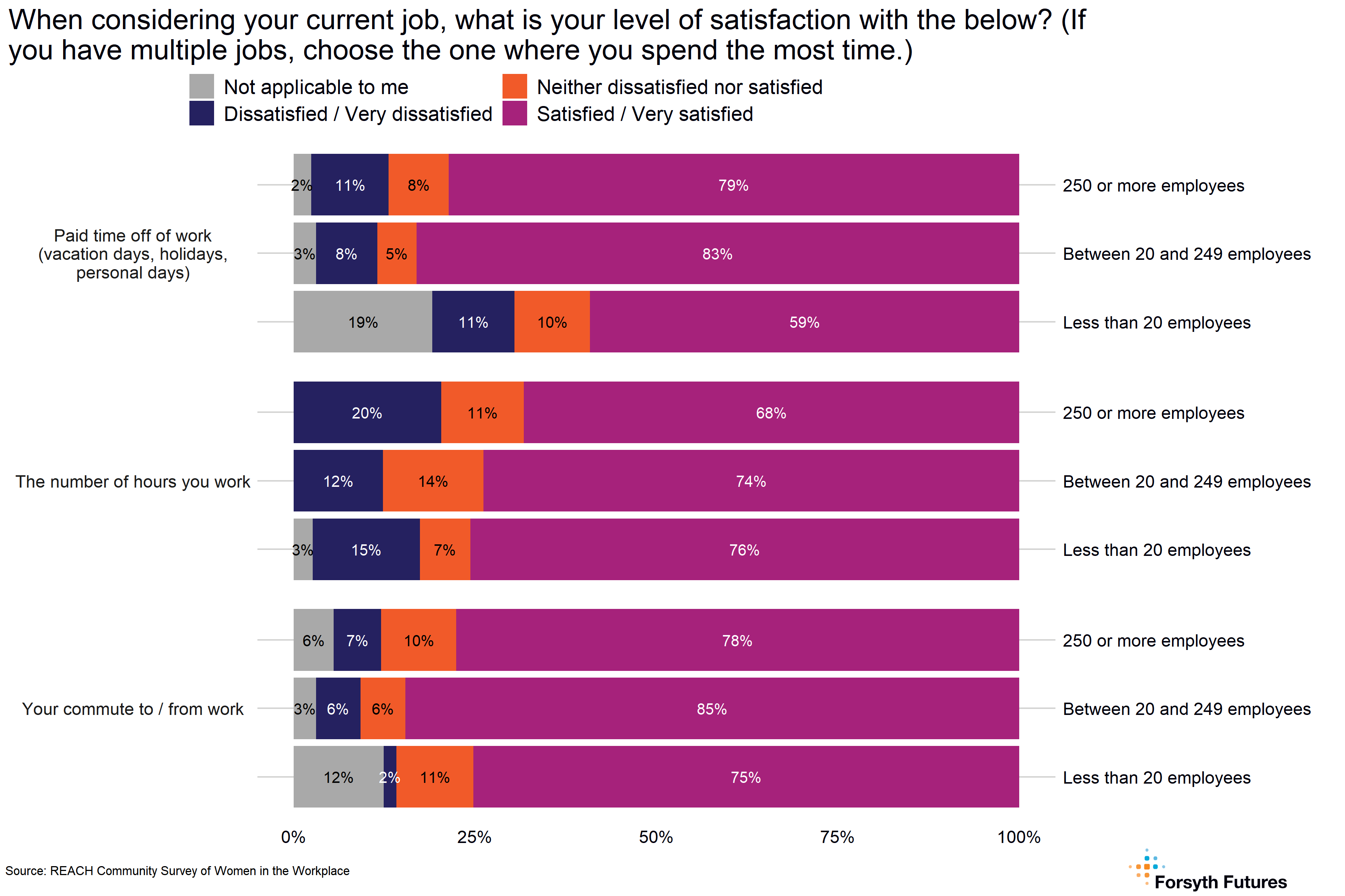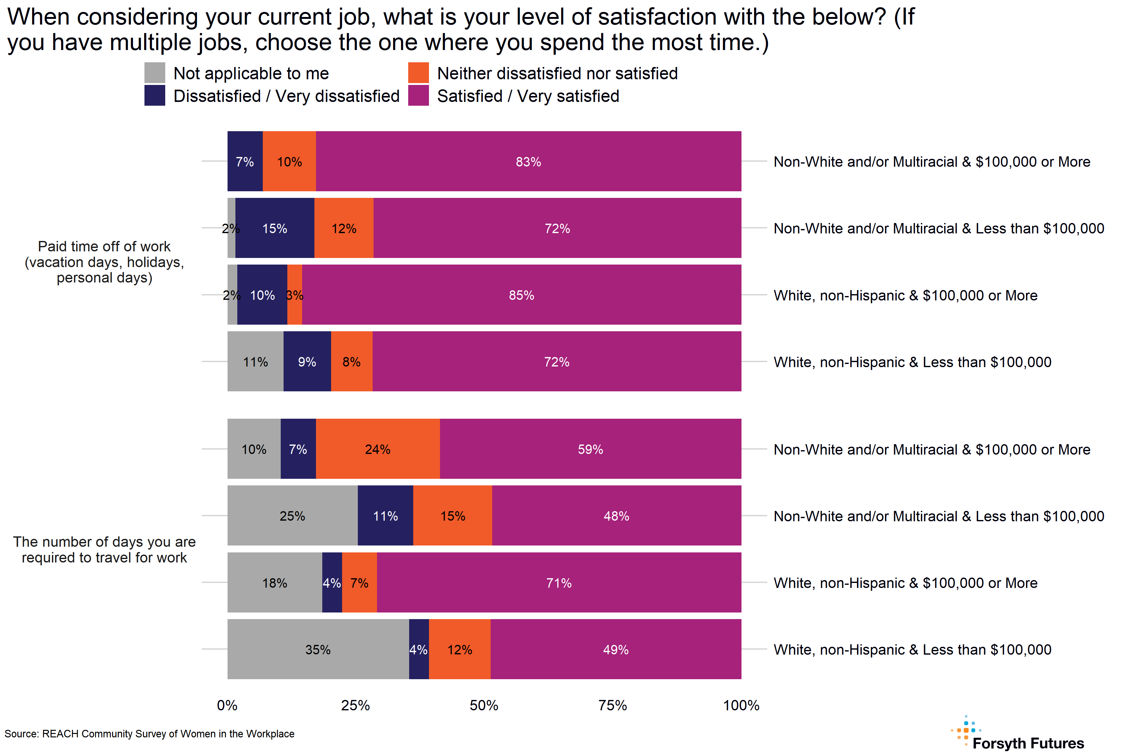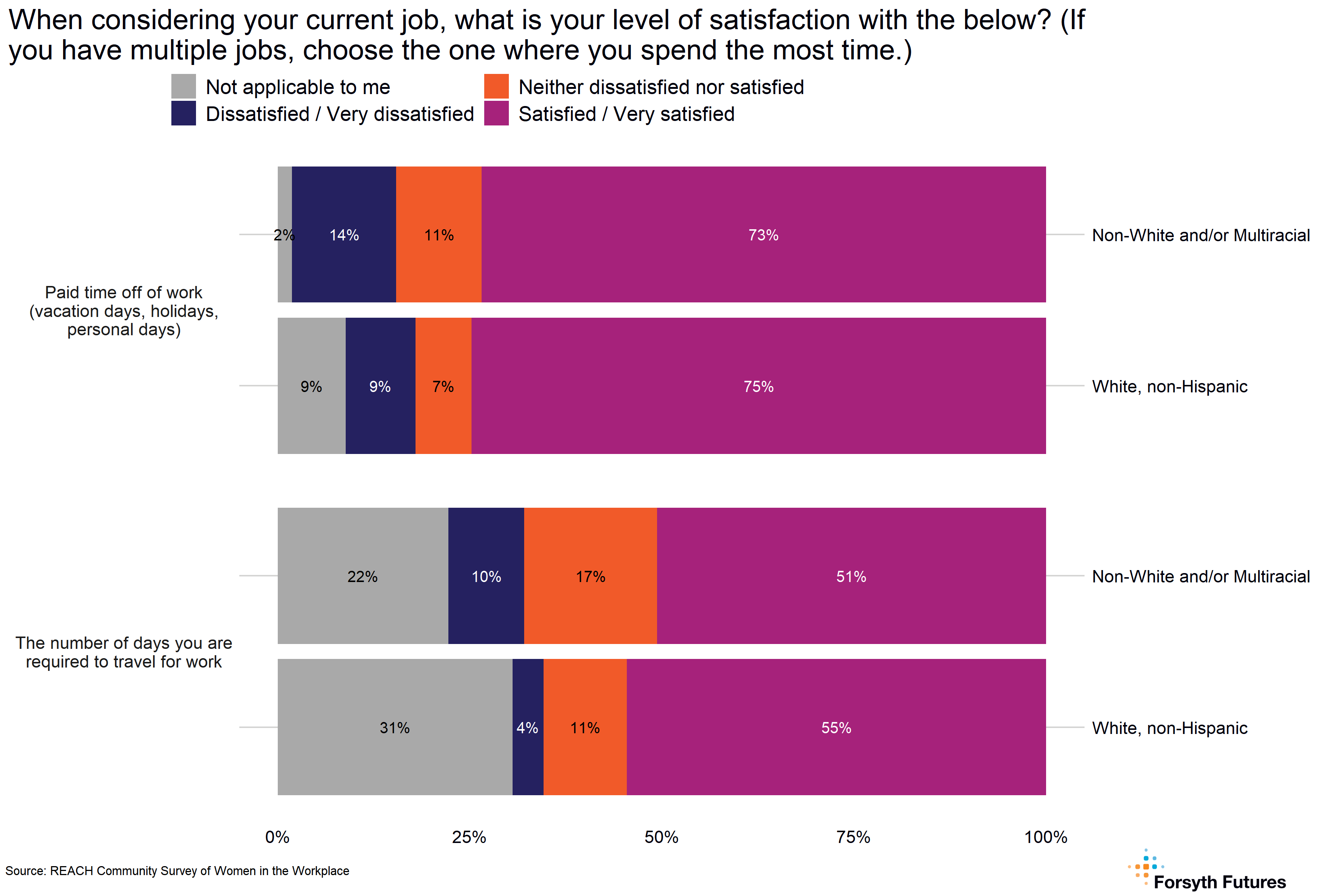 - When rating different aspects of satisfaction with their jobs, women from different backgrounds reported different satisfaction levels the most consistently when rating their paid time off and flexible working opportunities.