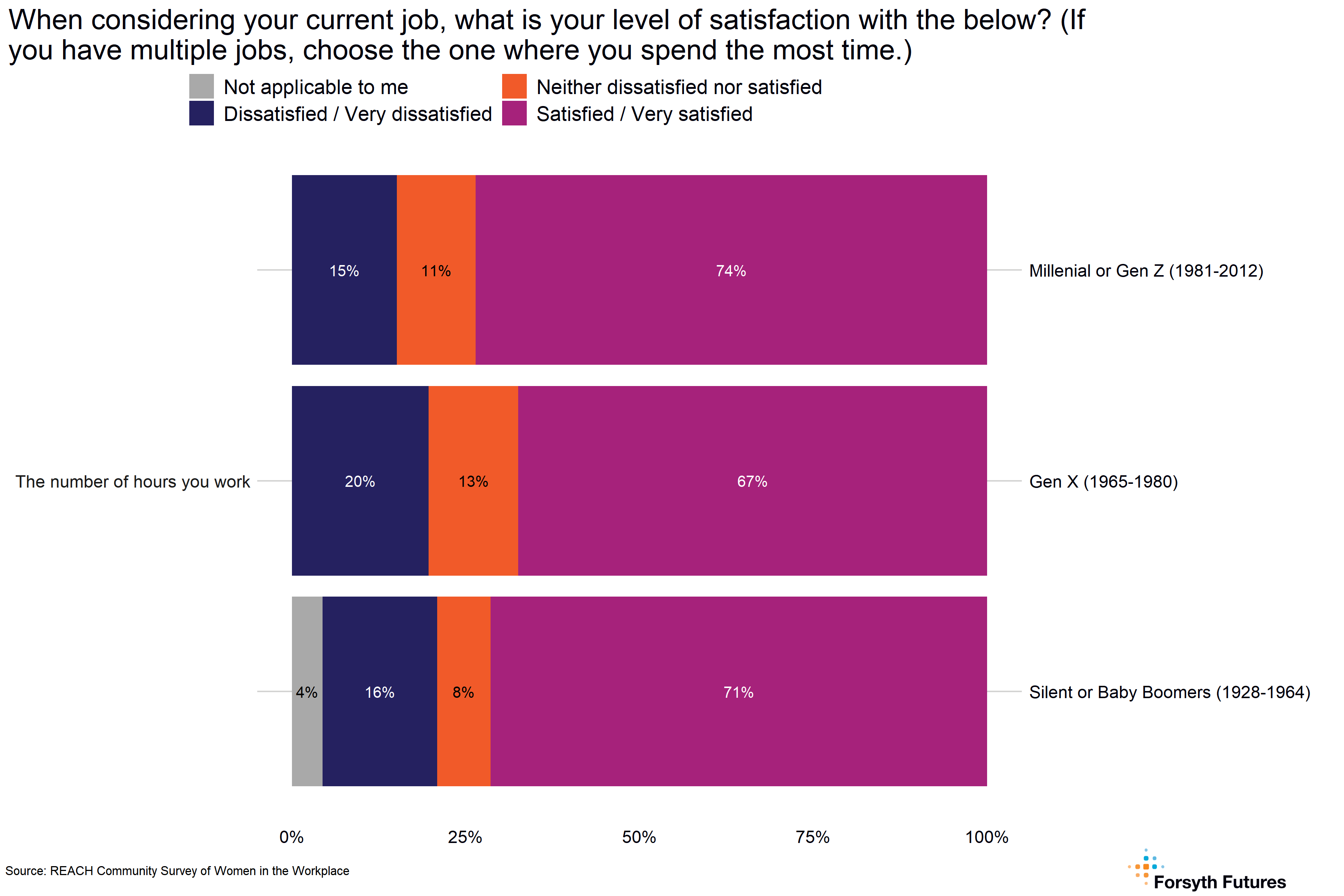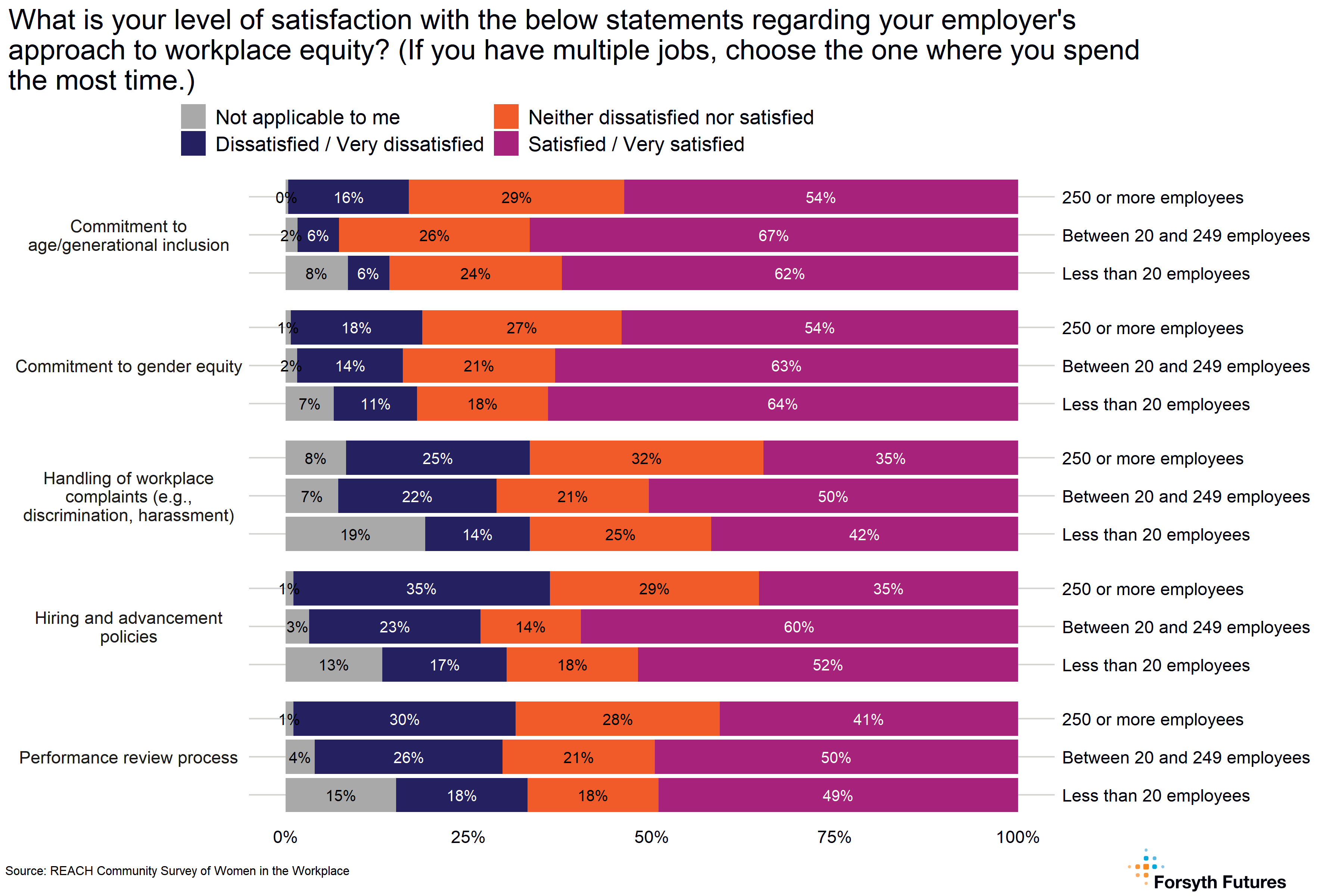- When rating different aspects of satisfaction with their employers’ commitment to workplace equity, women’s responses varied by all the disaggregations examined except age / generation for commitment to gender equity, handling of workplace complaints, and hiring and advancement policies.
