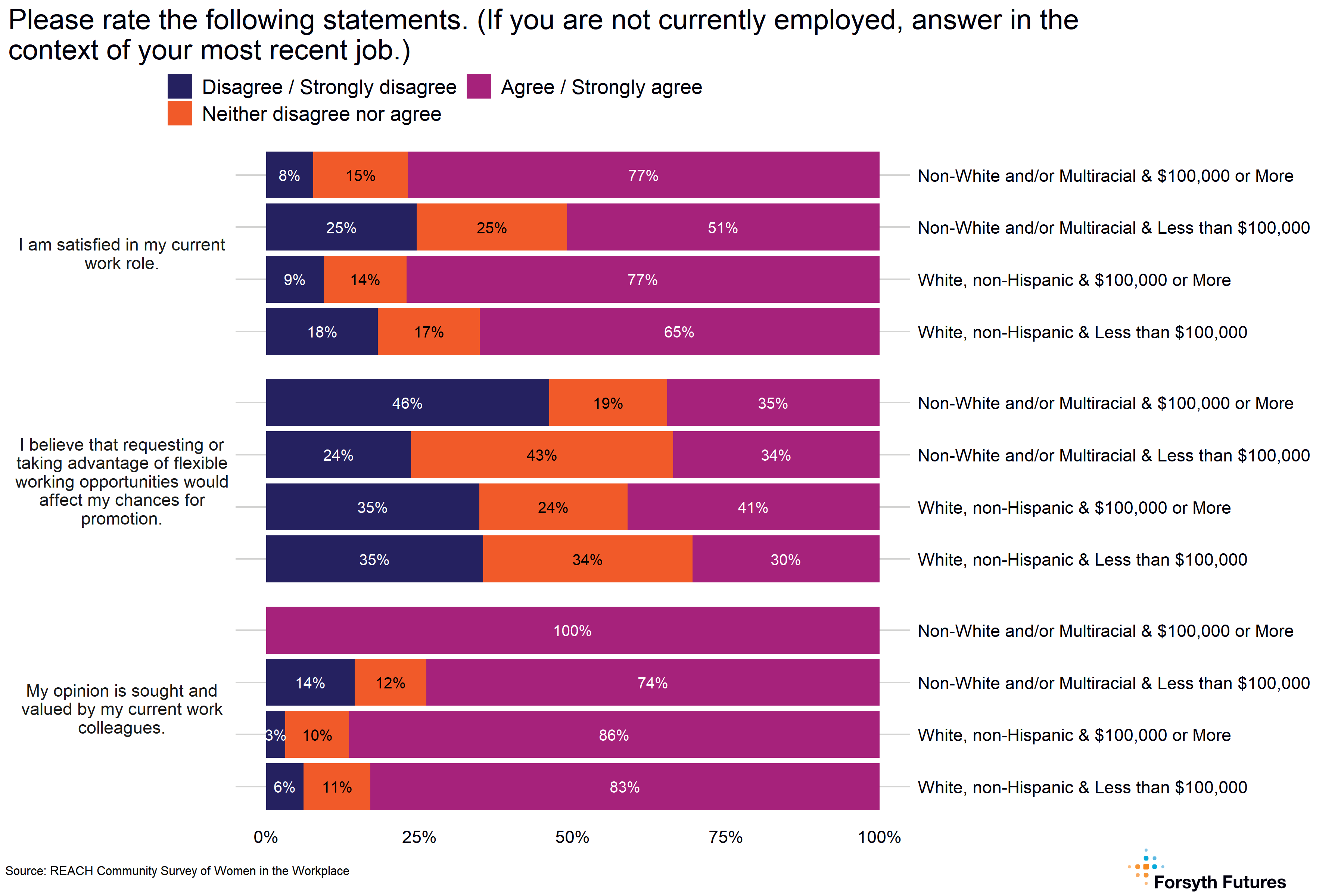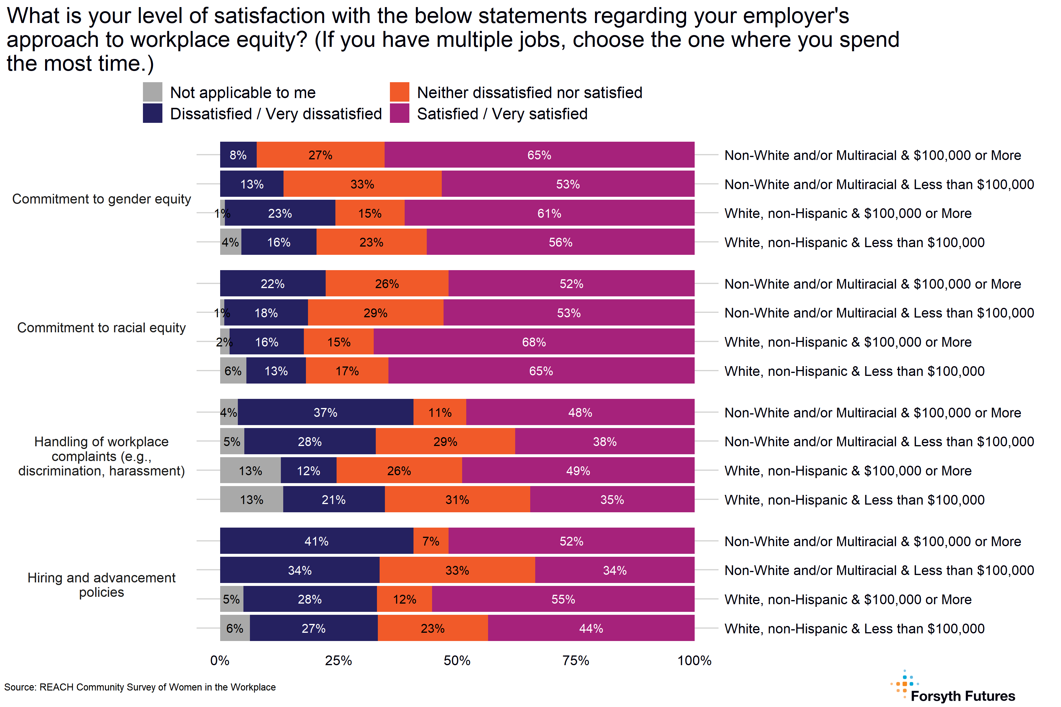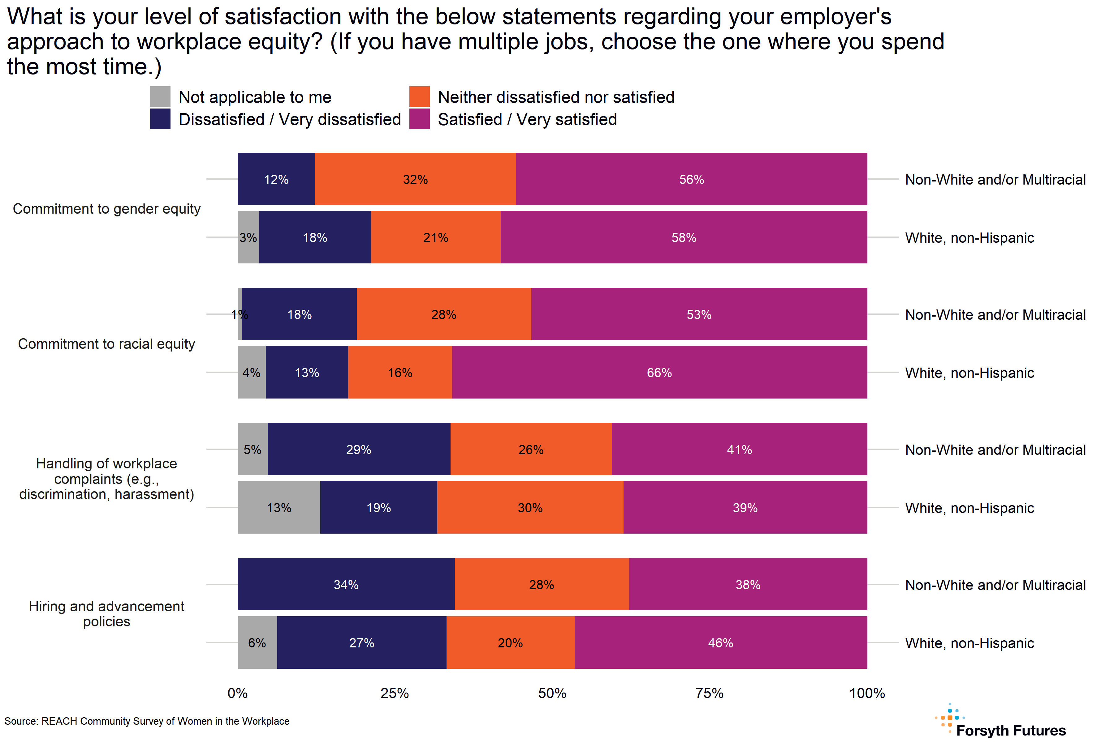Among the disaggregations, analysts found the following statistically significant relationships between the level of satisfaction with the statements regarding one’s employer’s approach to workplace equity:
