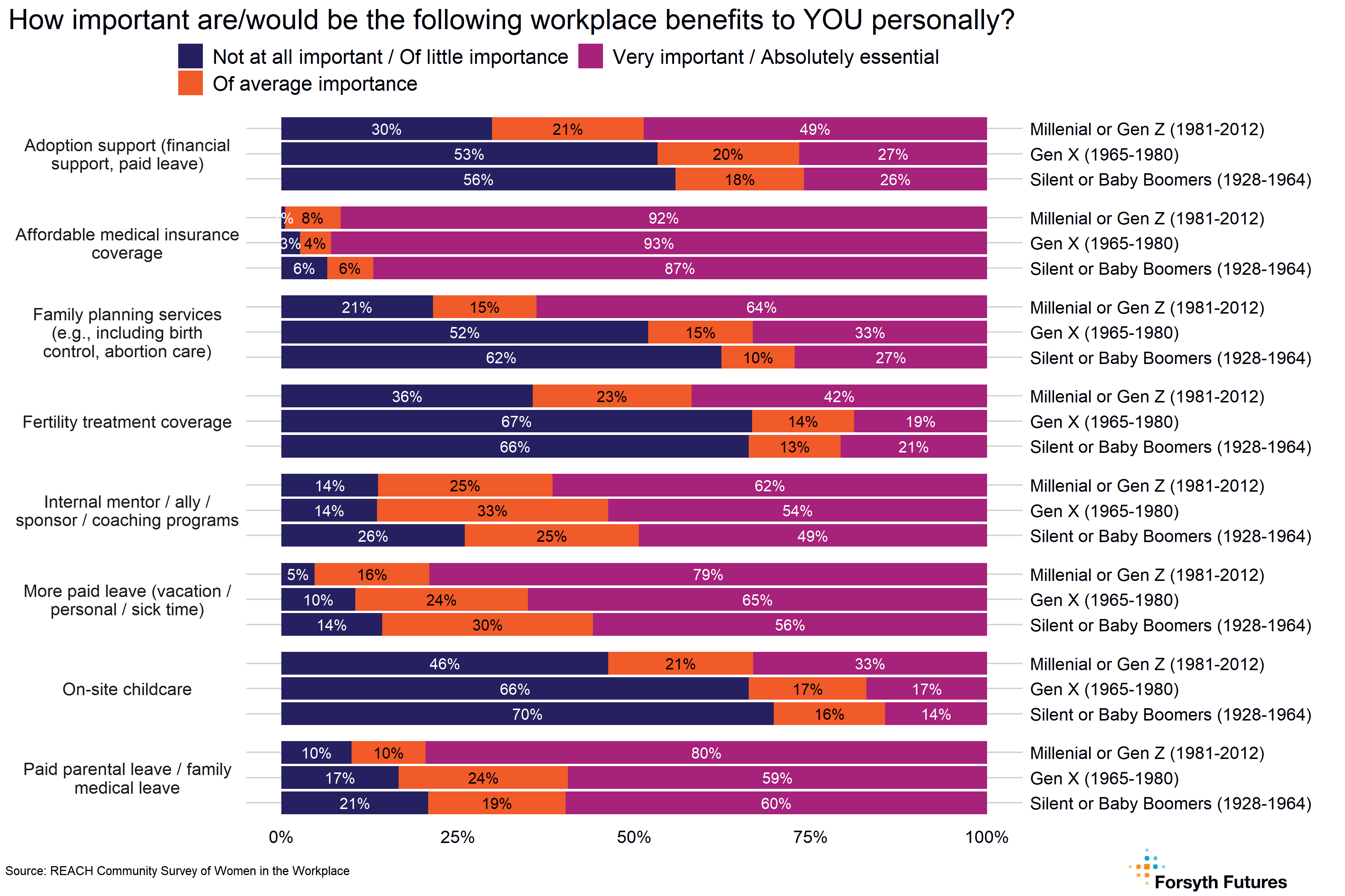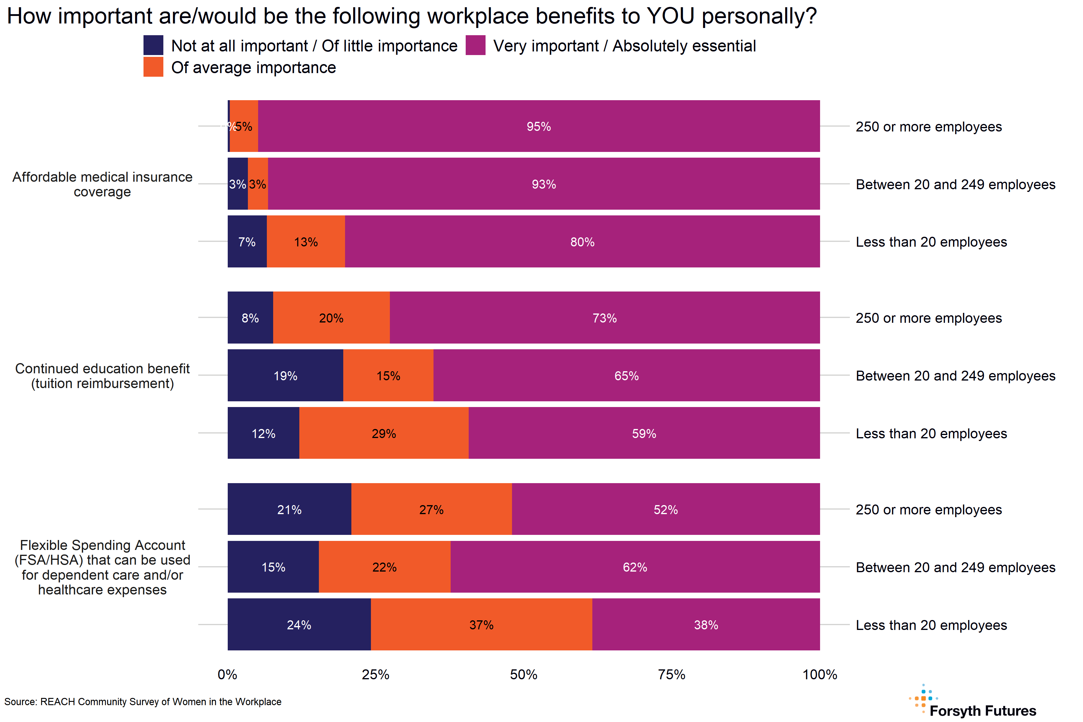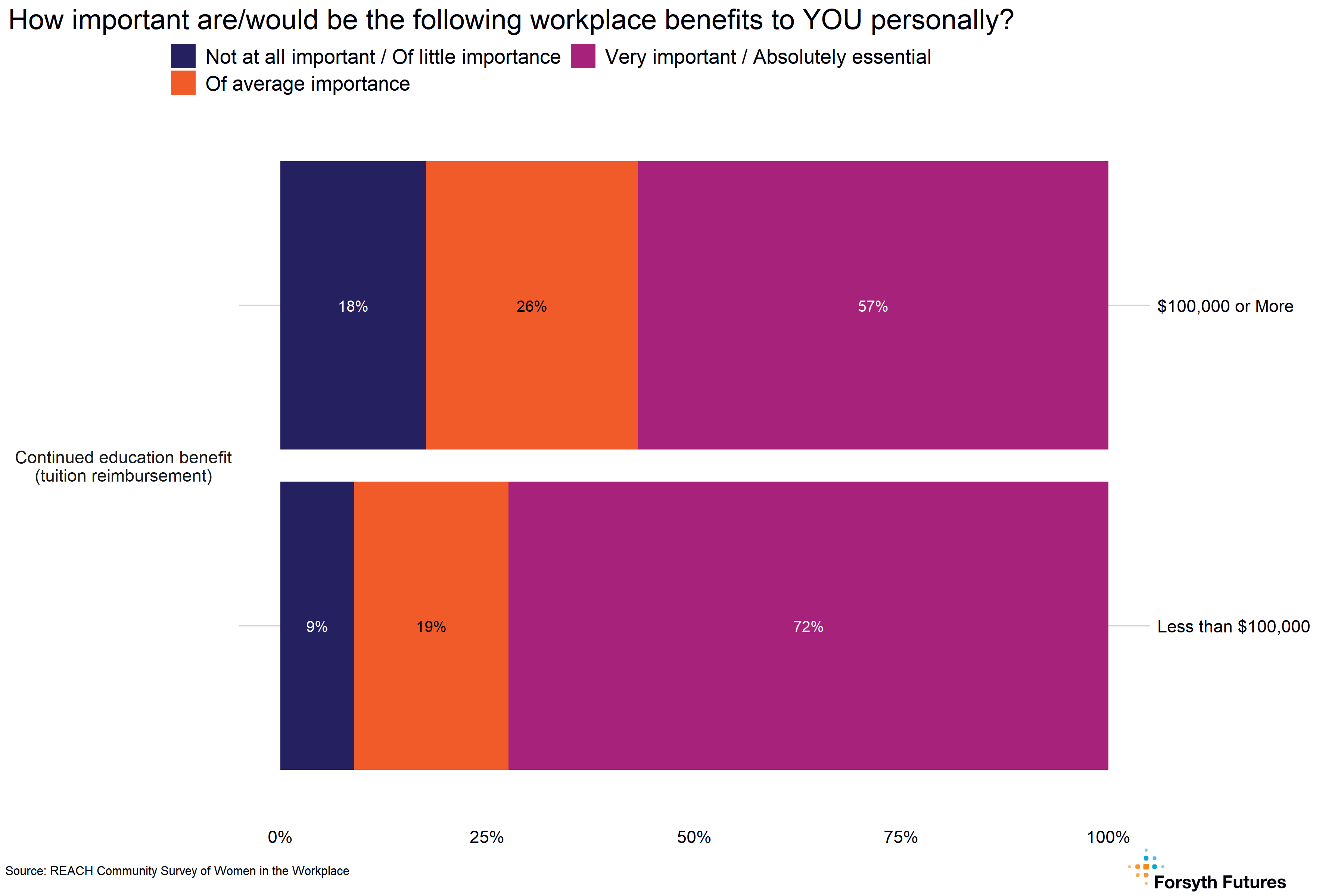 - Out of all the benefits assessed, women from different backgrounds reported the most consistent variation in satisfaction levels across demographic groups with continuing education opportunities.