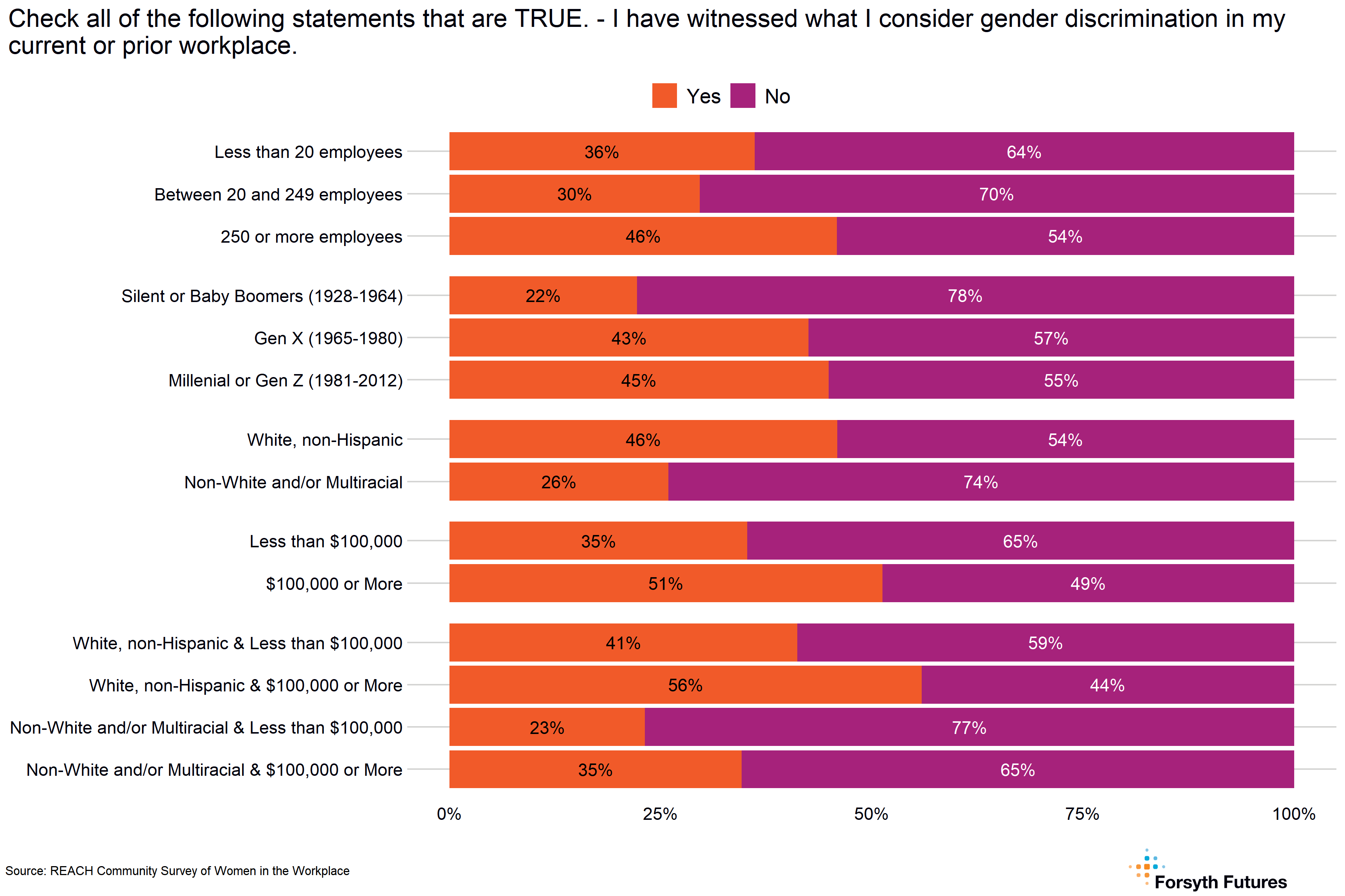 - Gender discrimination showed the highest variation in how various groups of women reported experiencing or witnessing it at work, among all the assessed forms of discrimination.