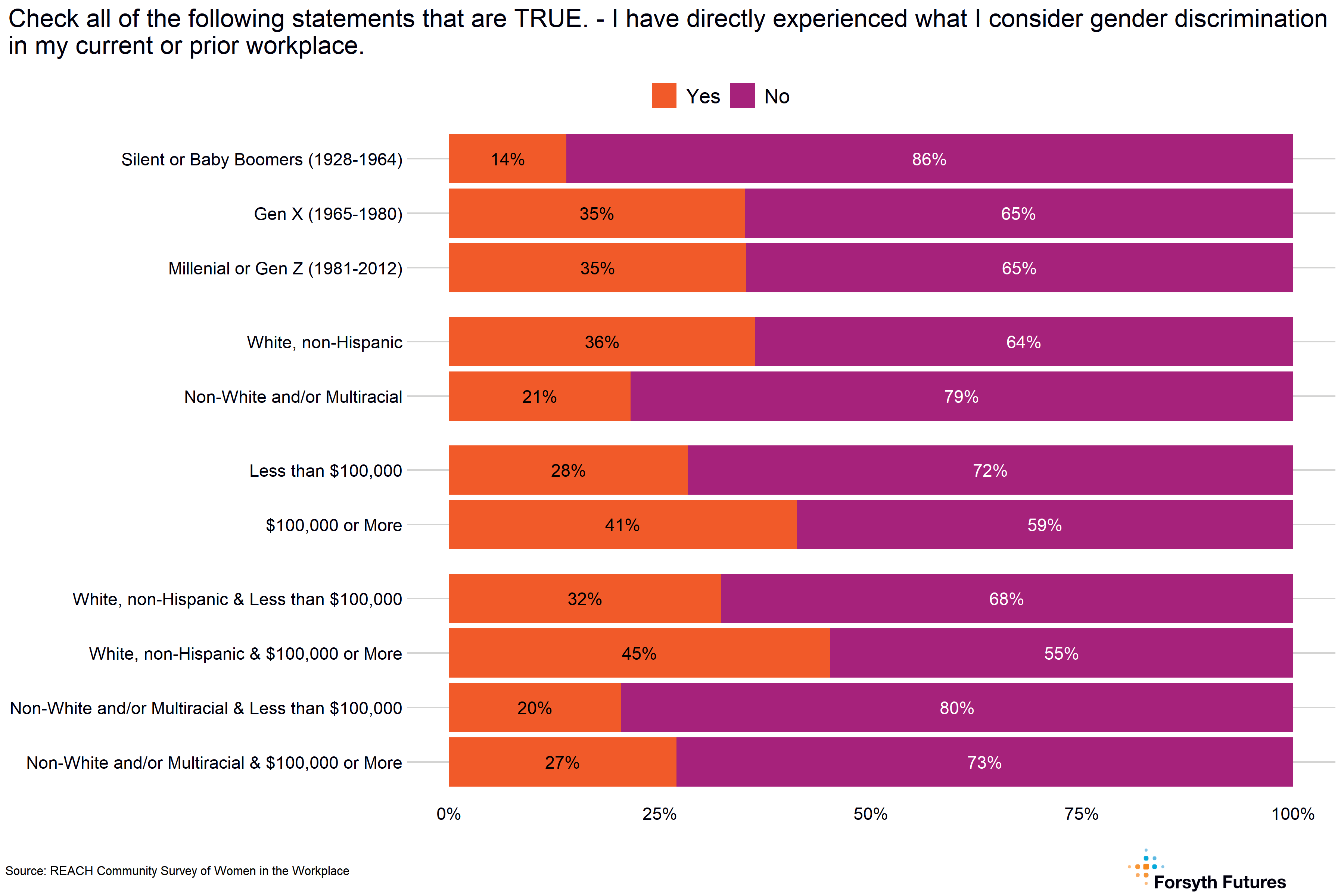 A statistically significant relationship existed between women’s age and directly experiencing gender discrimination or sexual harassment. Additionally, women who reported directly experiencing gender discrimination varied by race / ethnicity, wage income, and race / ethnicity and wage income together. No statistically significant relationships were found between witnessing or directly experiencing bullying or ageism and the disaggregating groups.