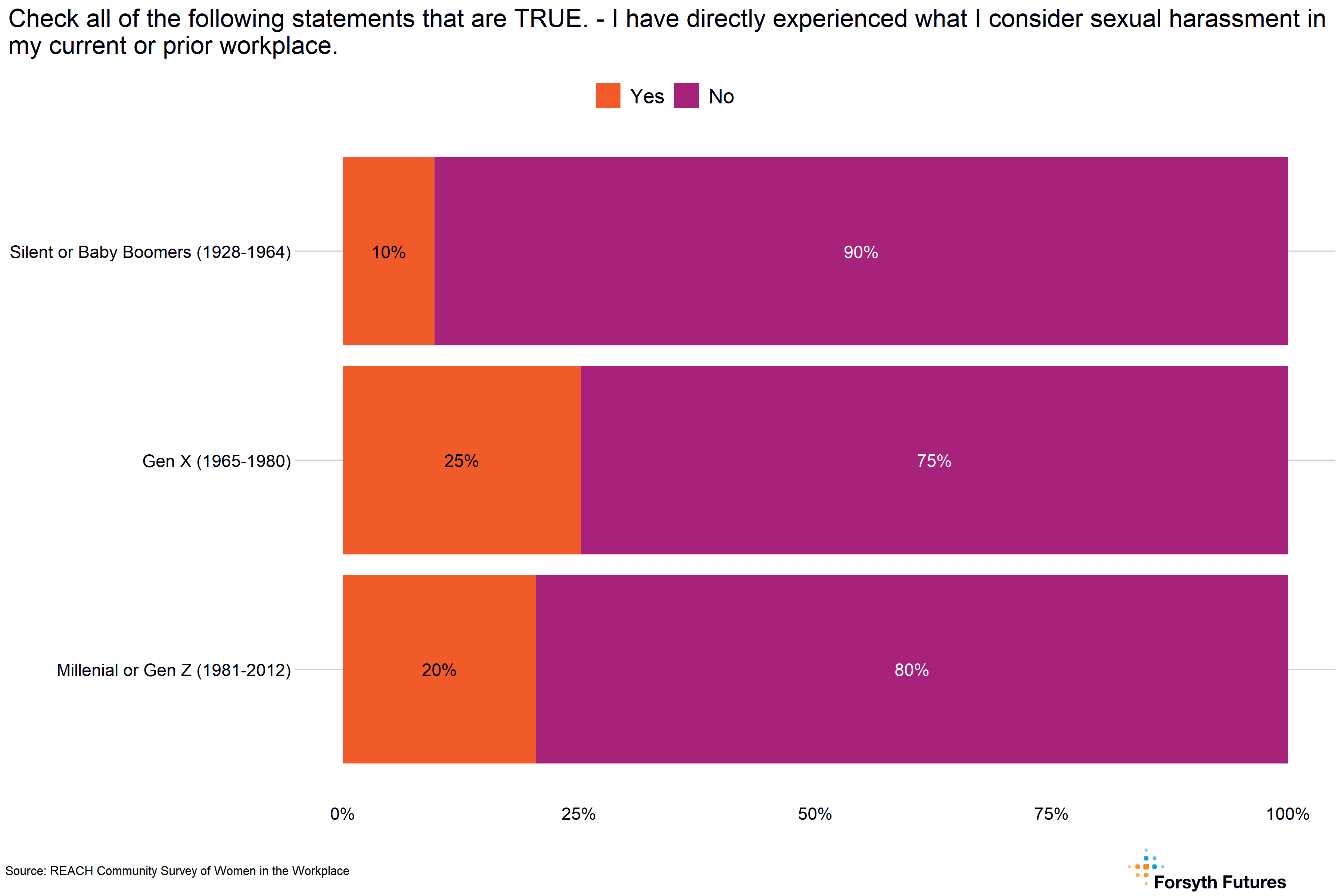 - Analysts found a statistically significant relationship between women’s age and experiencing sexual harassment at work.