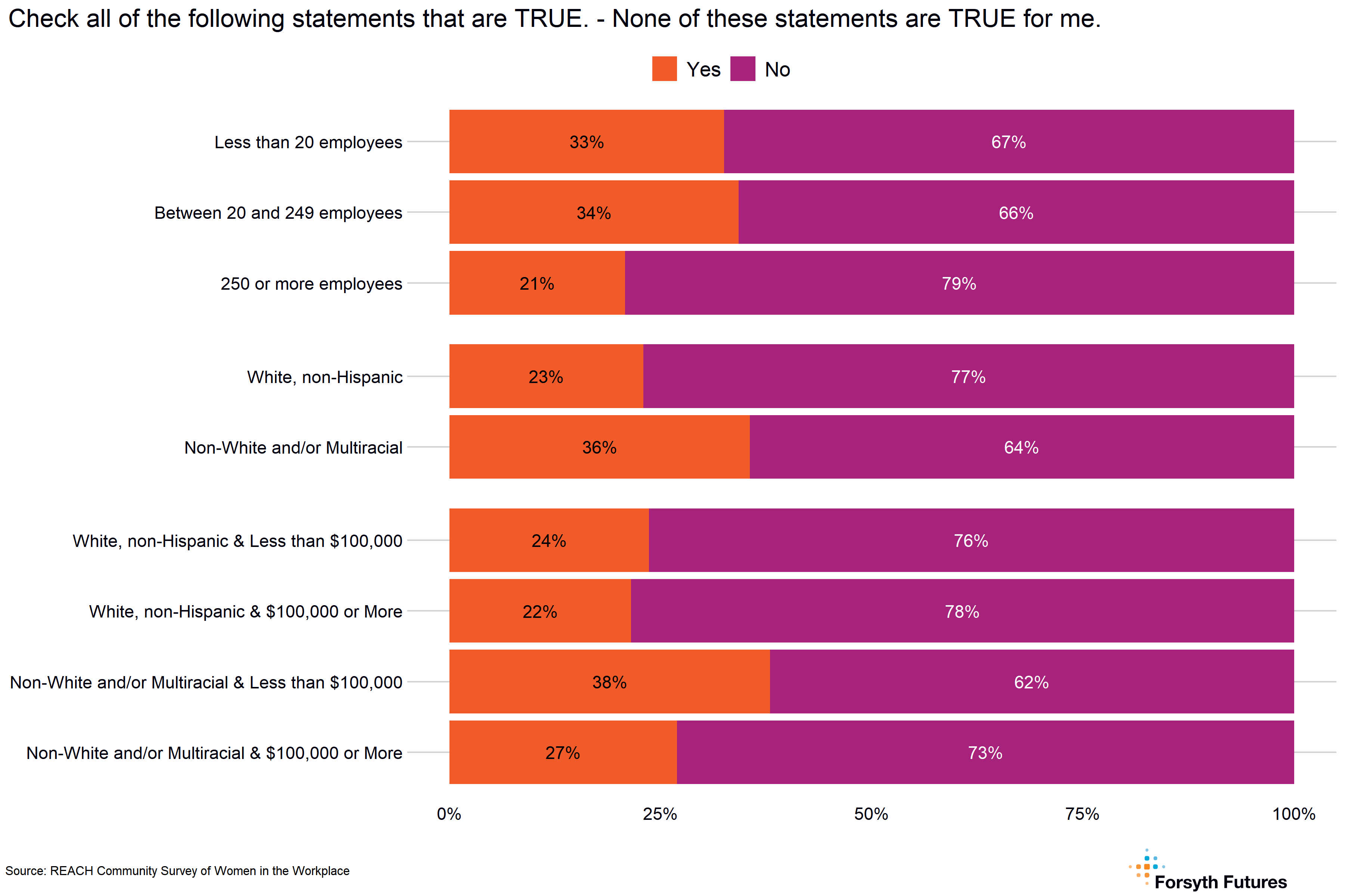 The following graphs illustrate information about different groups based on the size of their employer, wage income, race / ethnicity, and race / ethnicity and wage income together. We only show the results we are sure are real, not just by chance. However, some of the visual differences we between the groups may be due to chance. Also, just because we don’t see a difference between two groups, it doesn’t mean there isn’t a real difference. It just means we don’t have enough information to be sure.