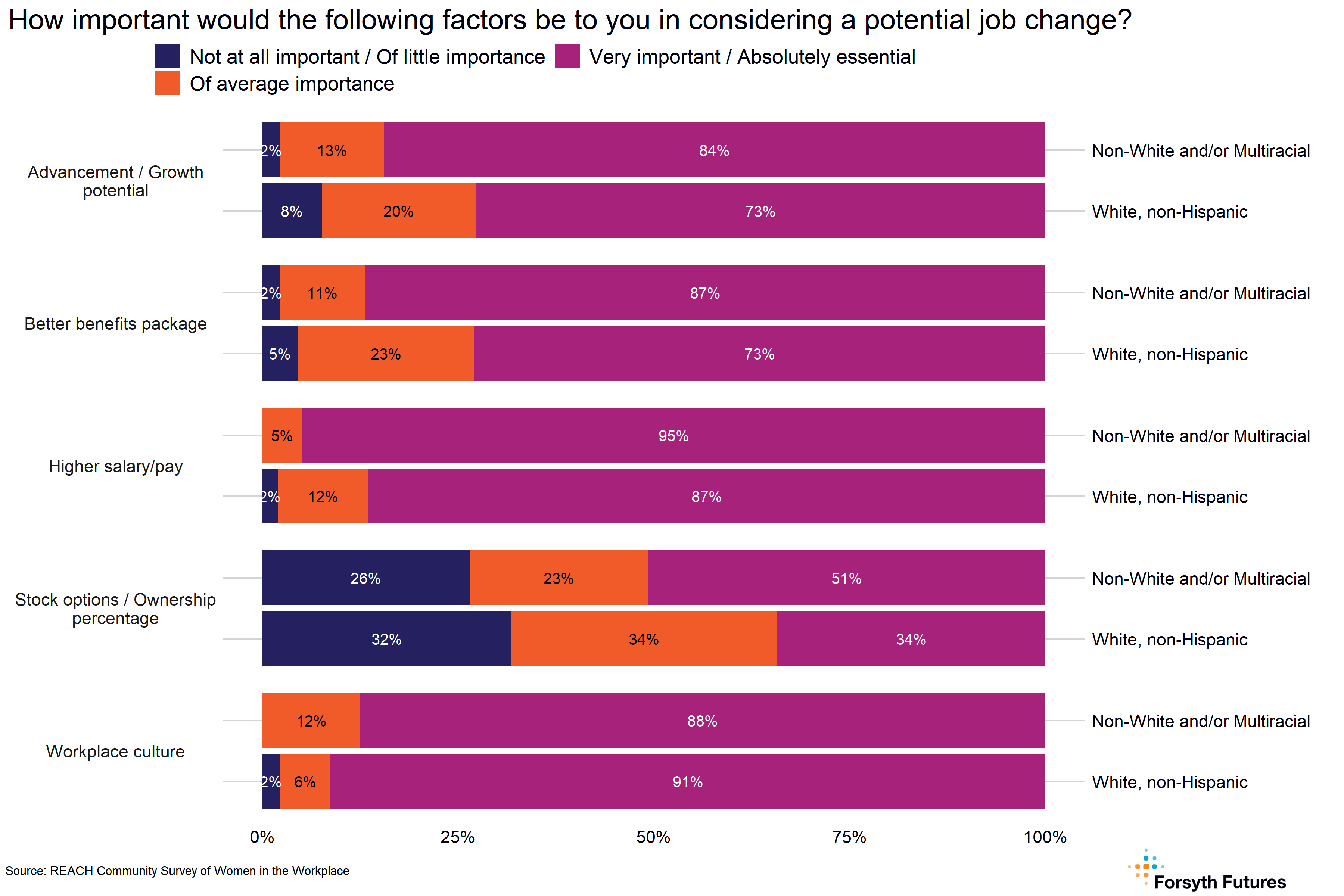 - Out of all of the benefits assessed, women from different backgrounds reported the most consistent variation in satisfaction levels across demographic groups with continuing education opportunities.