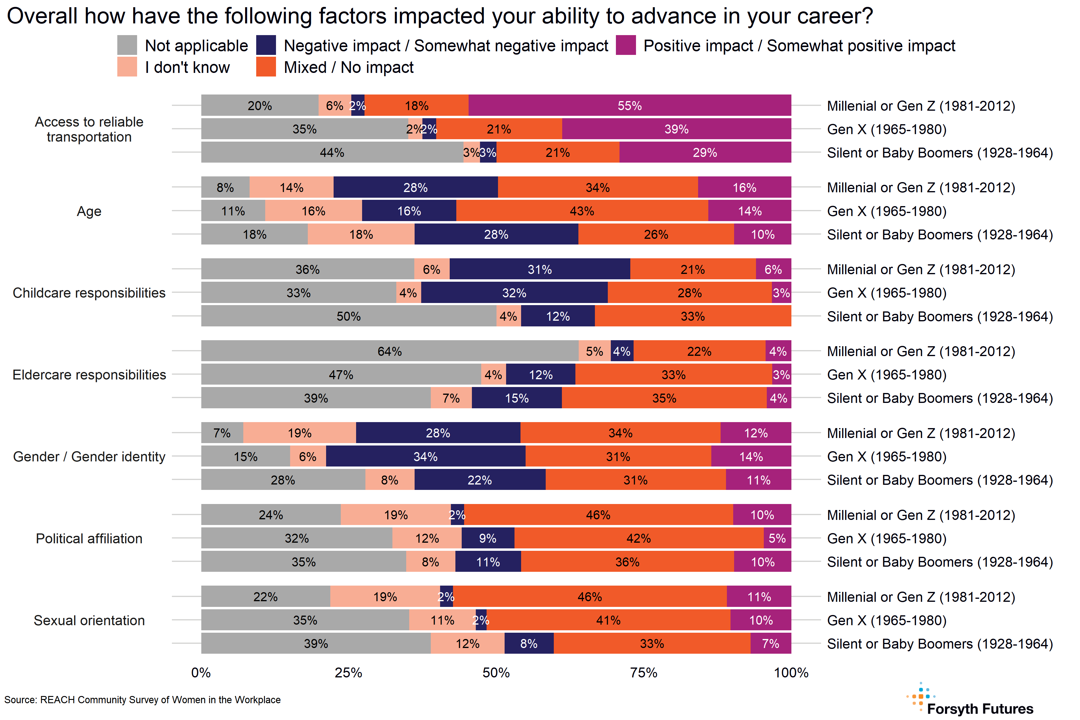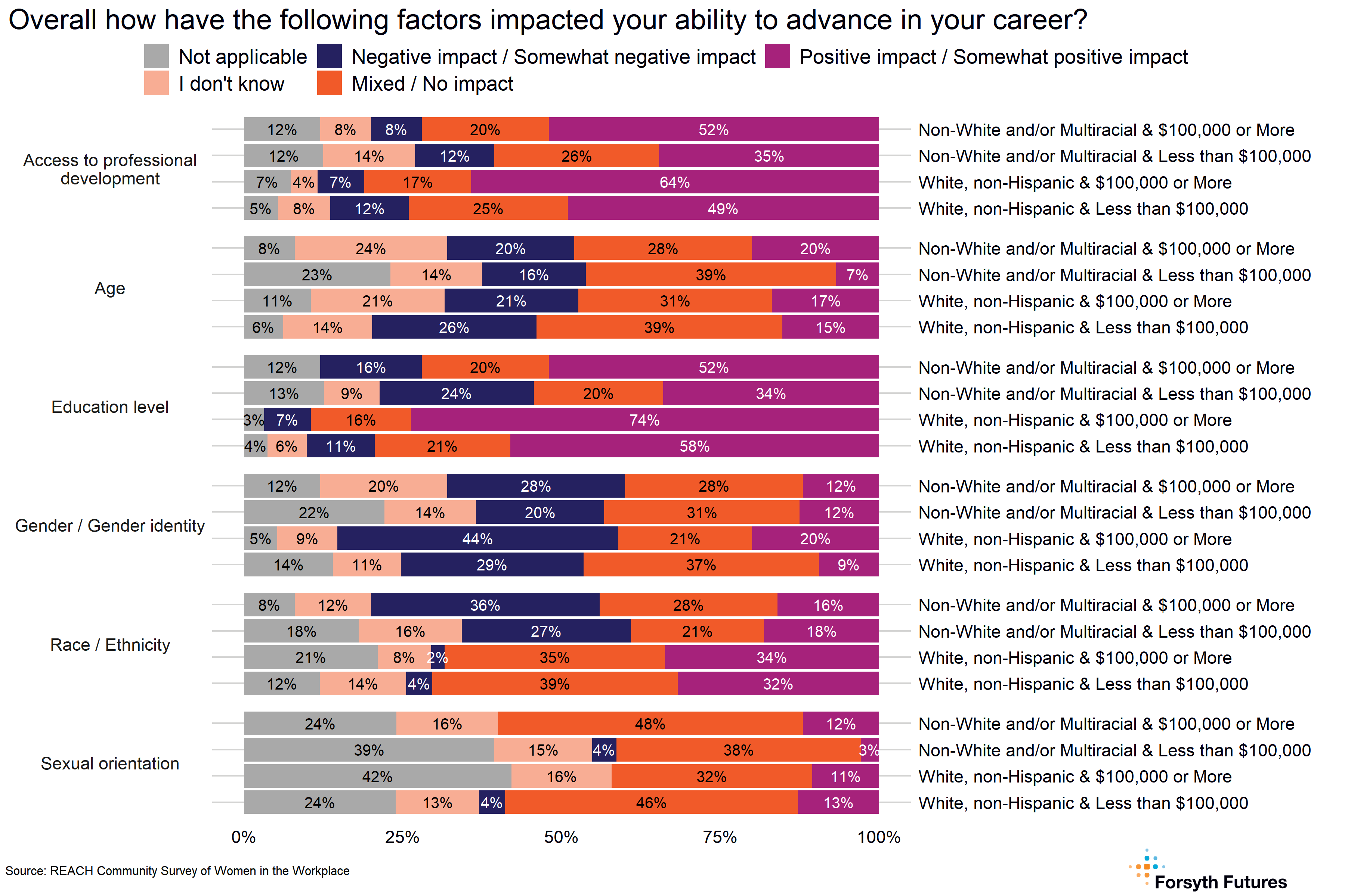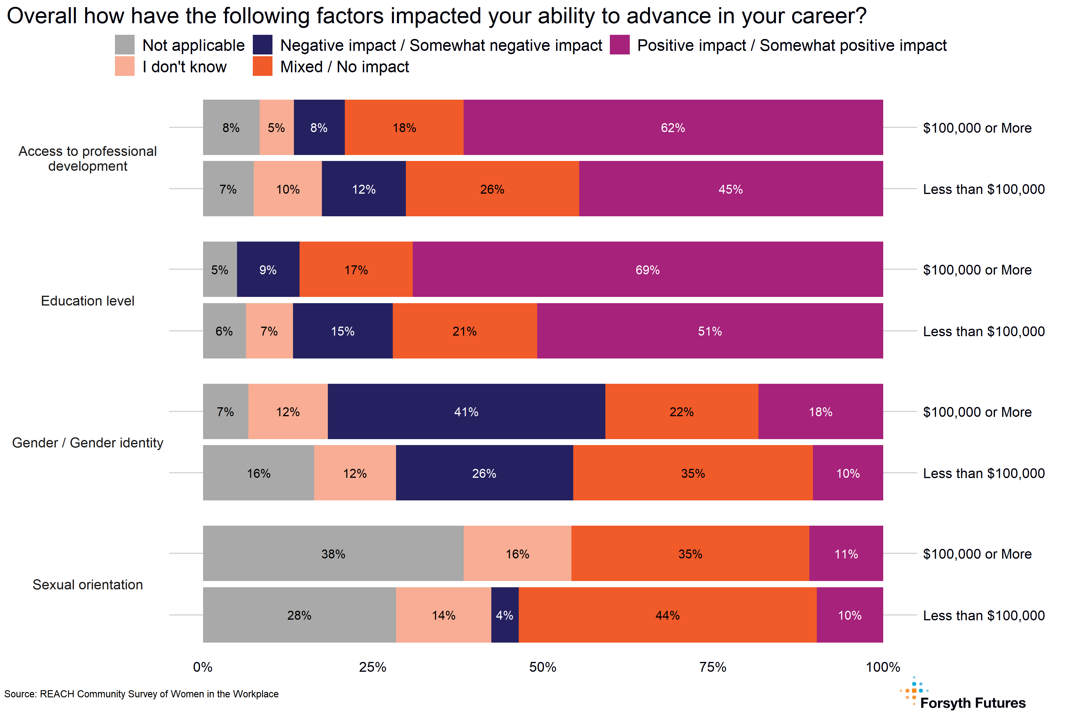 Among the disaggregations, analysts found the following statistically significant relationships between the factors that influence career advancement: