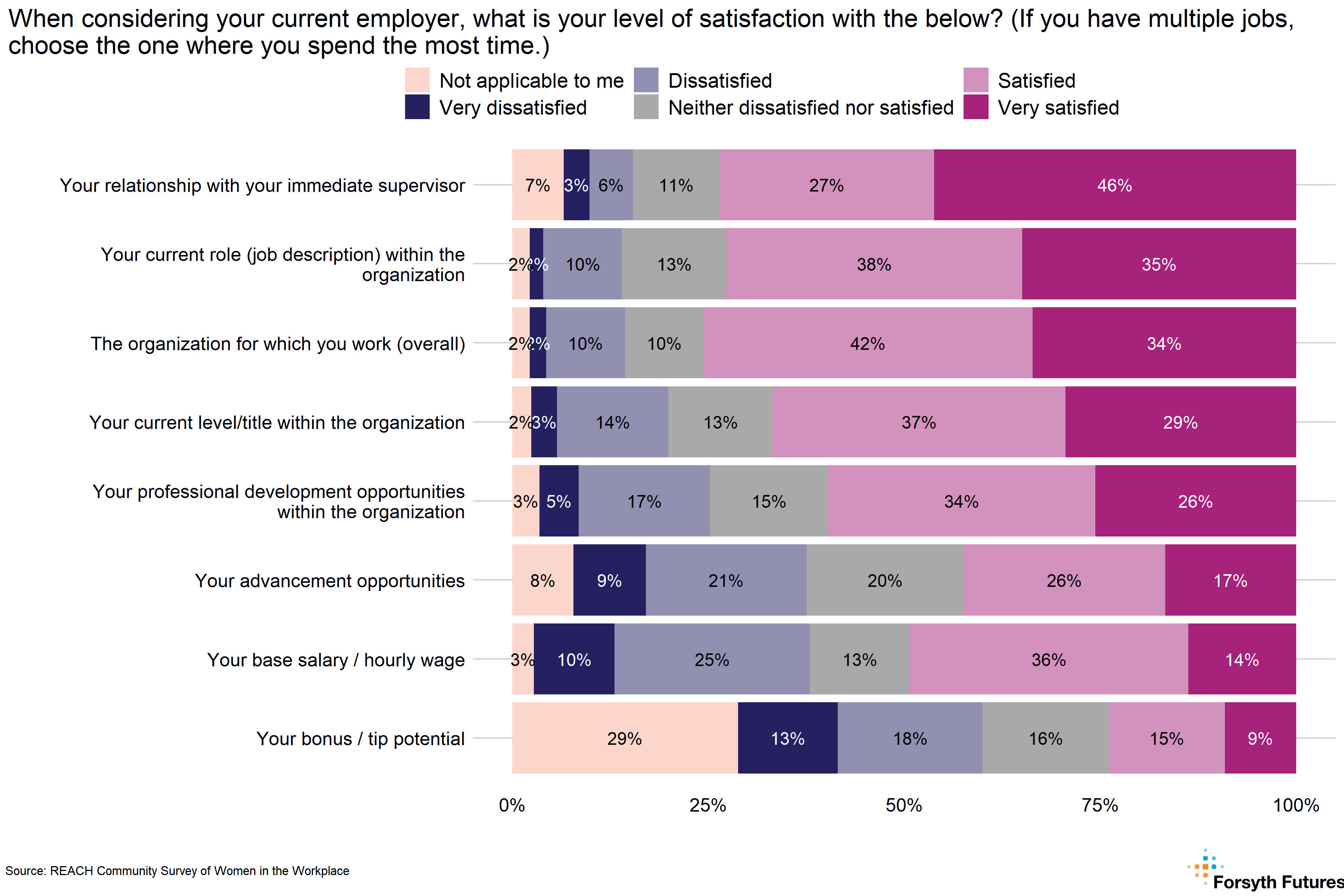 This section is broken down into four subtopics that cover women’s job satisfaction, their satisfaction with workplace benefits, experiences with discrimination at work, and the positive and negative factors affecting career advancement. Questions included in this section had varying levels of instructions for respondents; those instructions are included in the data visualizations as they were stated in the survey.