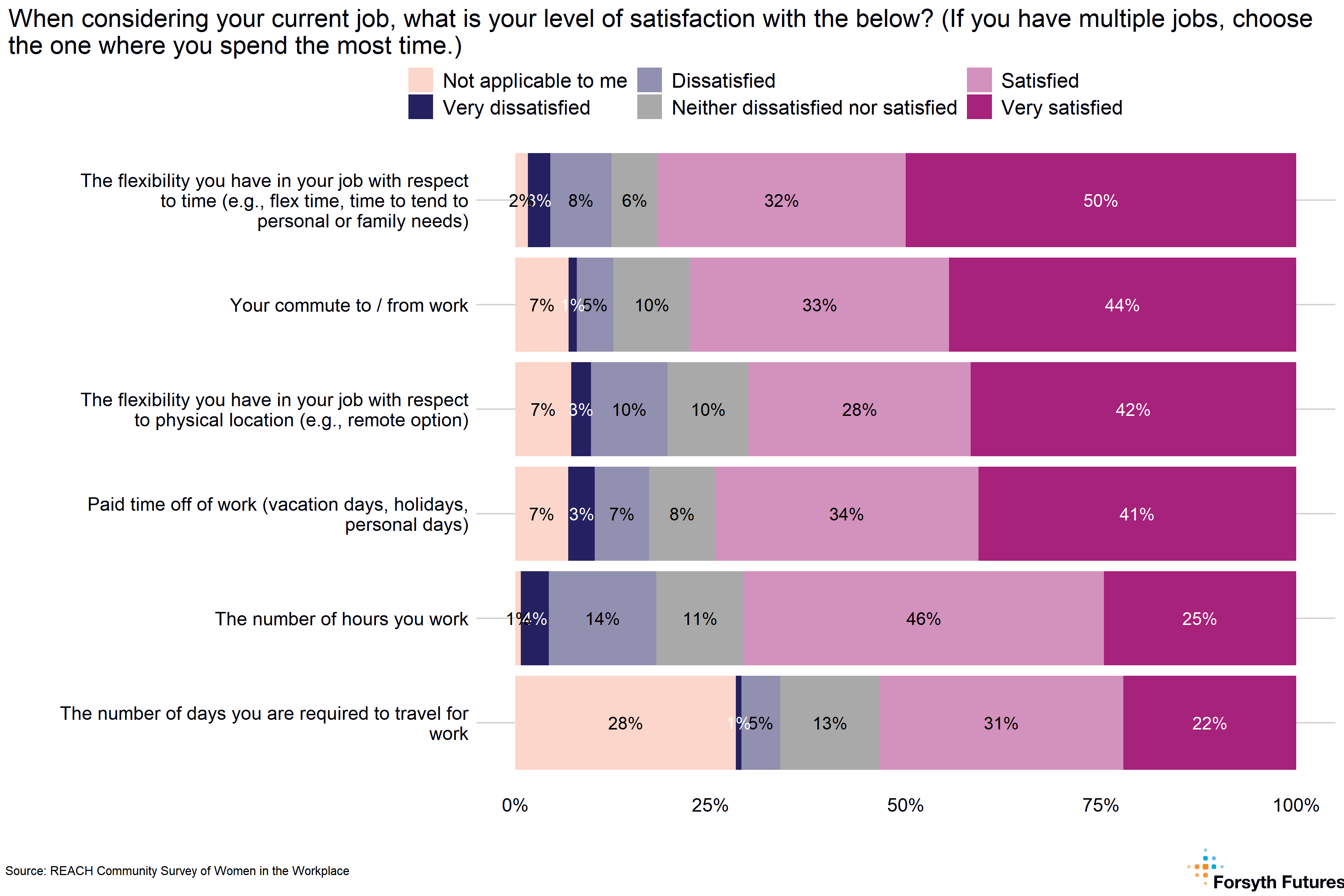 Overall, women reported high levels of satisfaction with their job including their commute to work, paid time off, and their job flexibility regarding time (e.g., flextime or personal time) and space (e.g., remote option). The highest level of dissatisfaction was with hours worked, but overall satisfaction levels were higher than not.