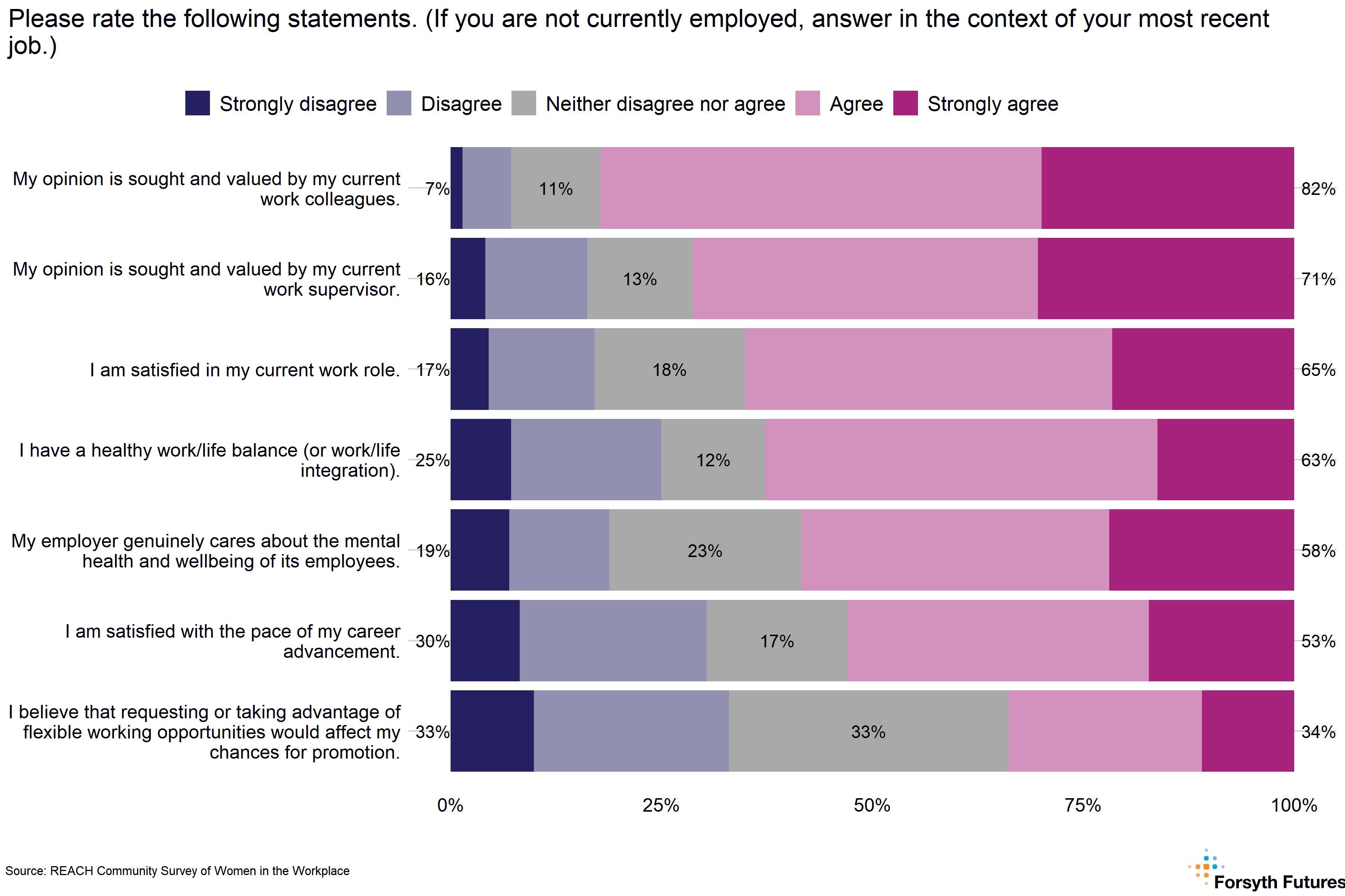 The majority of women in this survey agreed or strongly agreed that they were satisfied with their current work role (65%) and their work-life balance (63%). In contrast, 17% of women disagreed that they were satisfied with their work role, and 25% disagreed with the statement on work-life balance. The ‘Women @ Work’ study by Deloitte reported about one-quarter (27%) of women rate their job satisfaction as poor or very poor and another 47% report their work-life balance as poor or extremely poor.