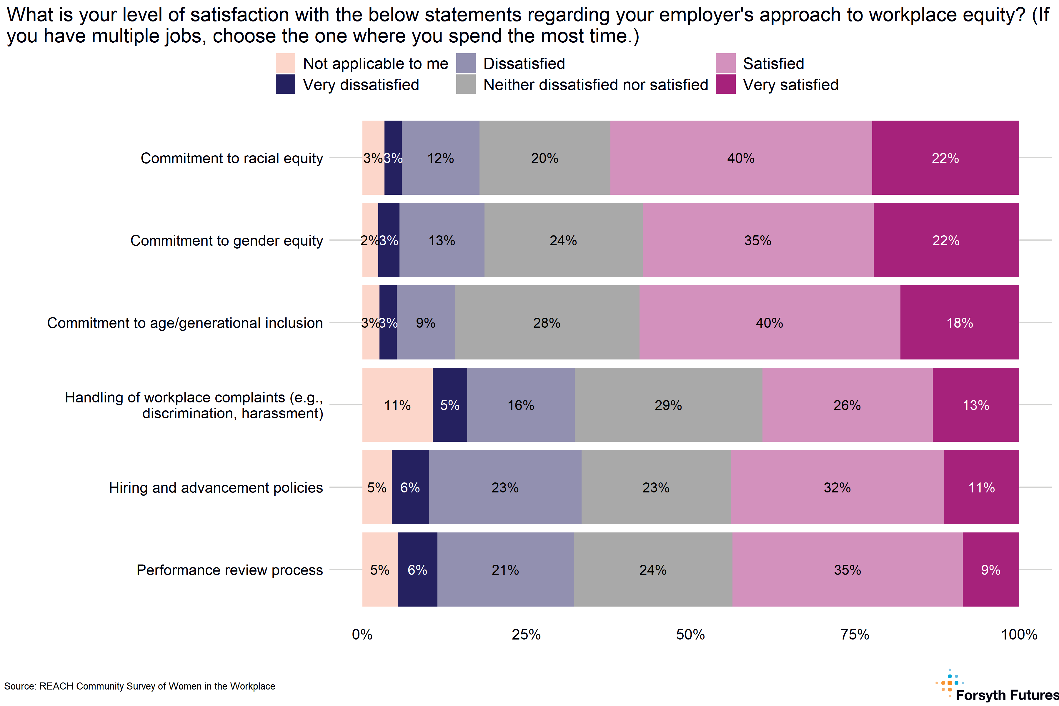 - A majority reported high levels of satisfaction with their employer’s commitment to workplace equity. However, when asked specifically about their organization’s hiring policies, advancement policies, and performance review process, they reported lower satisfaction.