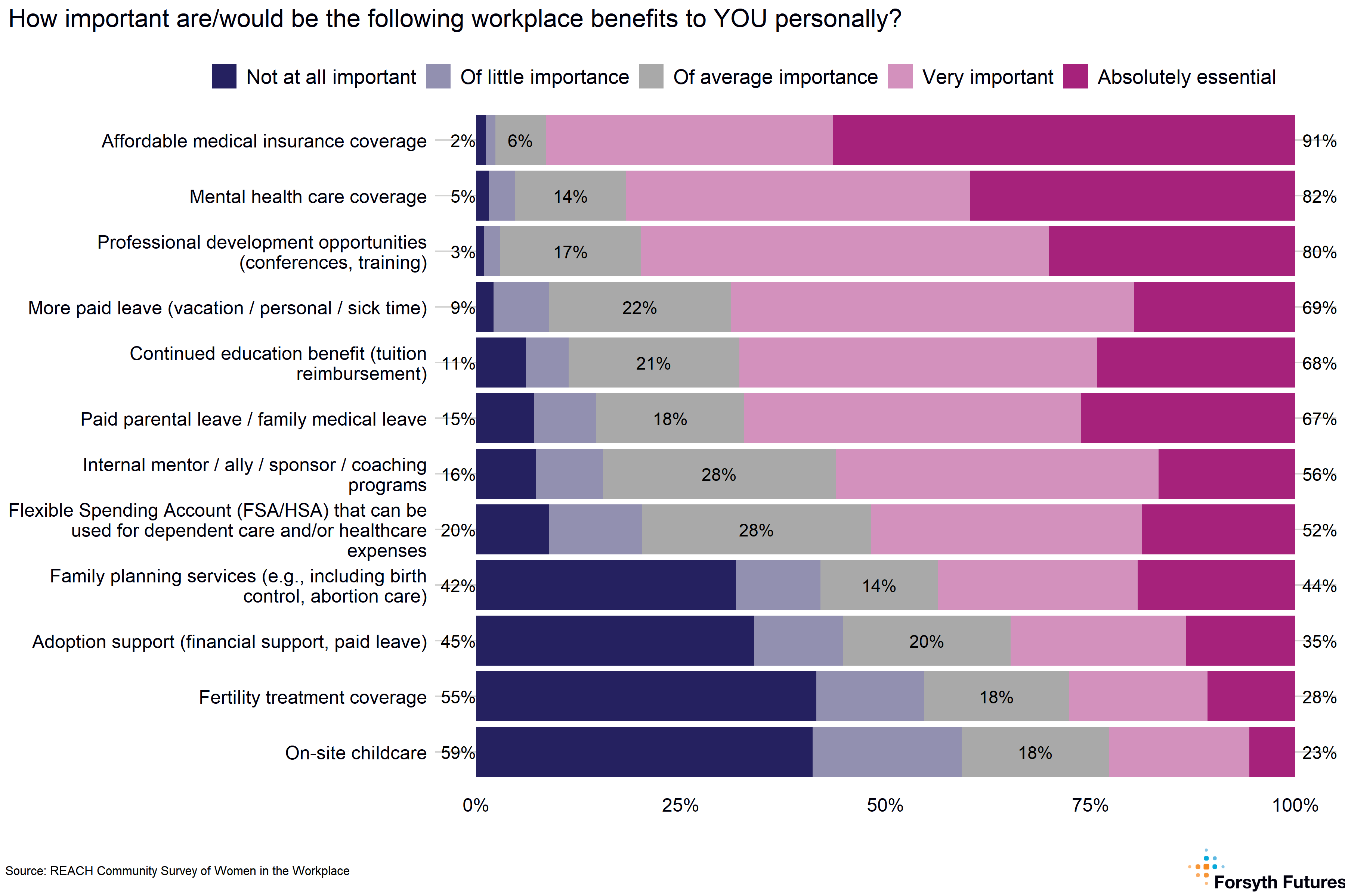 The overwhelming majority (91%) of women said that affordable health care insurance was a very important/absolutely essential benefit to them personally. The next two highest-rated benefits were mental health coverage (82%) and professional development opportunities (80%). The lowest-ranking benefits were on-site child care (59%) and fertility treatment coverage (55%).