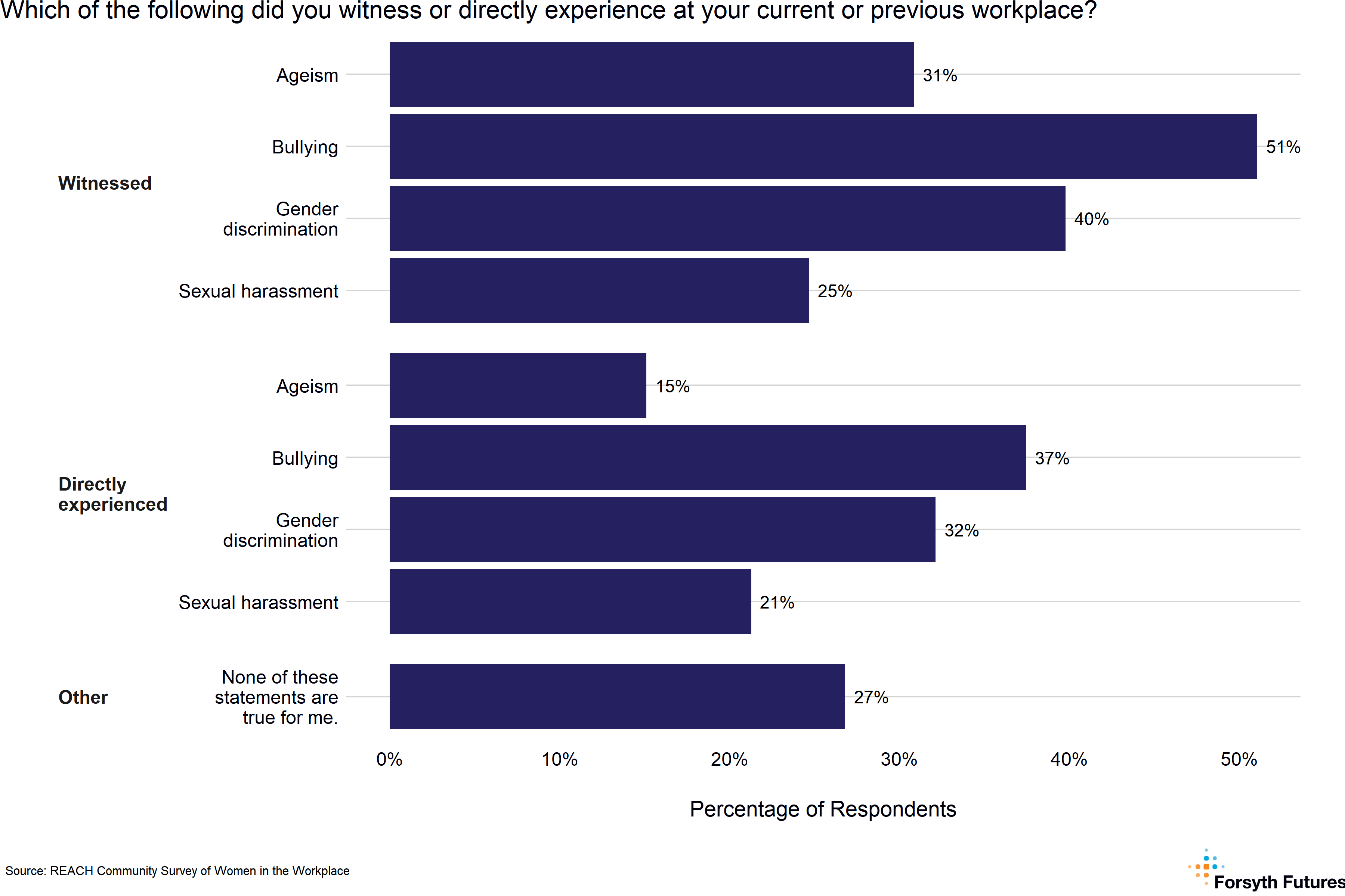 - More than half of responding women reported witnessing bullying in the workplace. About a quarter of women surveyed reported not experiencing or witnessing any of those forms of discrimination.