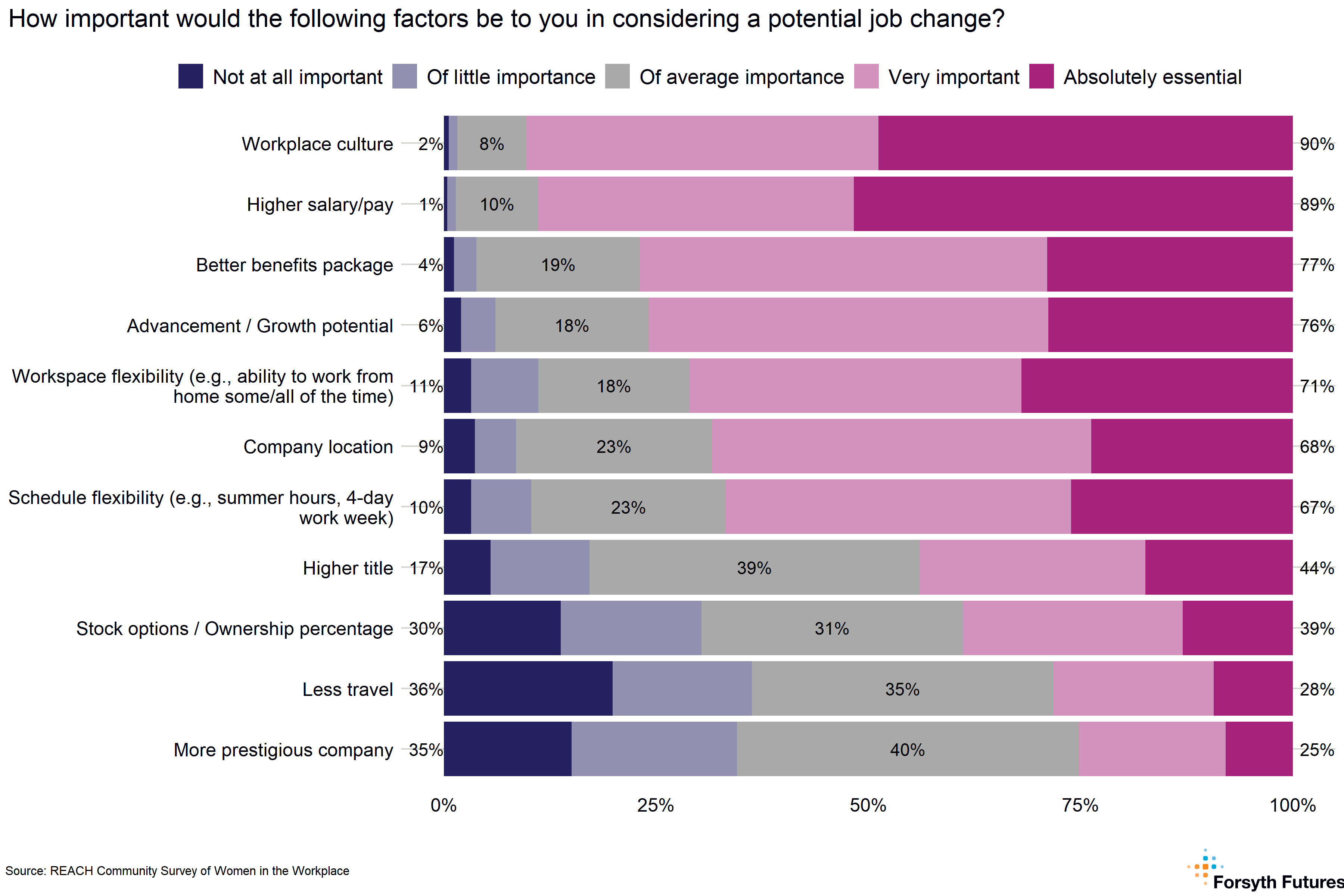 Women reported that workplace culture (90%) and higher salary/pay (89%) were very important/absolute essential factors for any potential job change. Less travel (36%) and working for a more prestigious company (35%) were considered the least important factors when considering a job change.